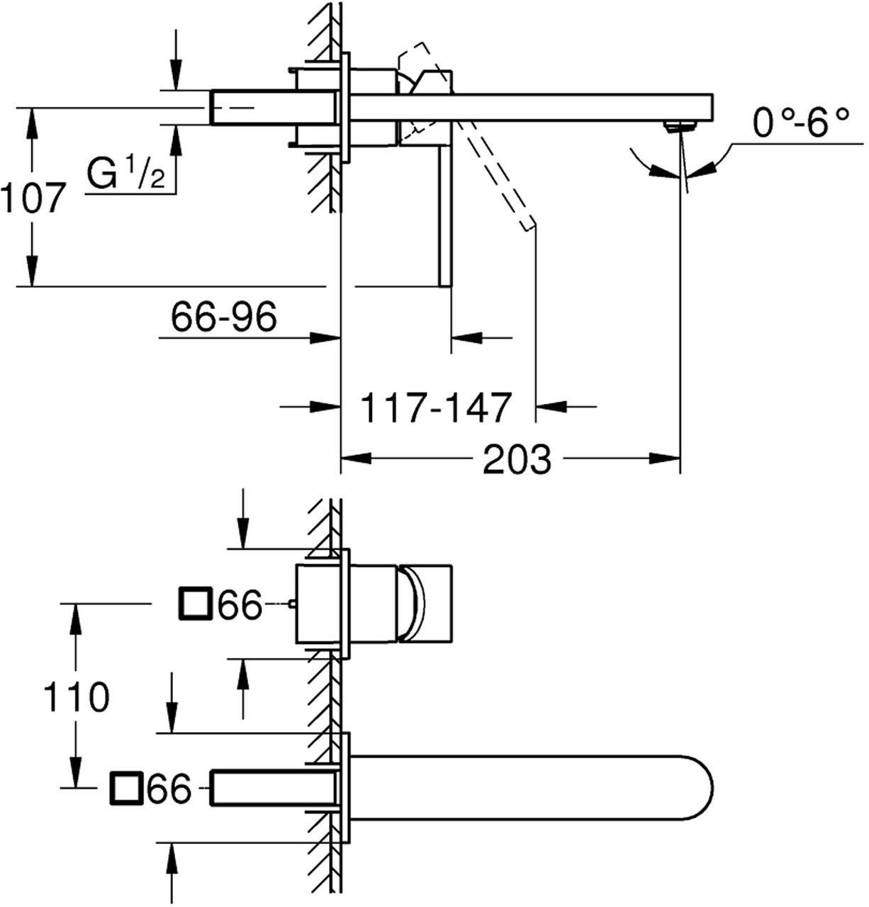 veggmontasjetilhørende innvendig del:23 200uten innbygningsdelerrosett i metallmetallhendelGROHE Long-Life overflateGROHE Water Saving-teknologi for mindre vannforbrukmaximum flow rate (at 3 bar): 5 l/minSpeedClean mousseurGROHE AquaGuide justerbar perlatorsenteravstand 110 mmfremspring 203 mmmin. trykk 1.0 barVann- og avløpsinstallasjoner må installeres av rørlegger.