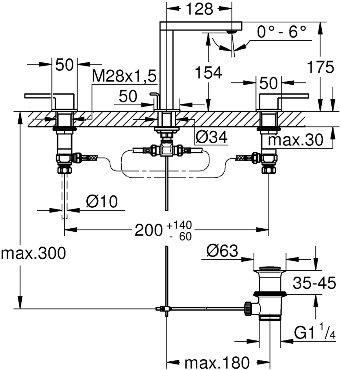 metallhendelkeramisk overdel 1/2", 90°GROHE Long-Life overflateGROHE Water Saving-teknologi for mindre vannforbrukmaximum flow rate (at 3 bar): 5 l/minSpeedClean mousseurGROHE AquaGuide justerbar perlatorrask installasjonoppløft med avløpsgarnityr 1 1/4"GROHE FastFixation installasjonssystemtrykkfaste, fleksible forbindelsesslangermellom mellomkropp og sideventilermutter 1/2" x 10,5Vann- og avløpsinstallasjoner må installeres av rørlegger.