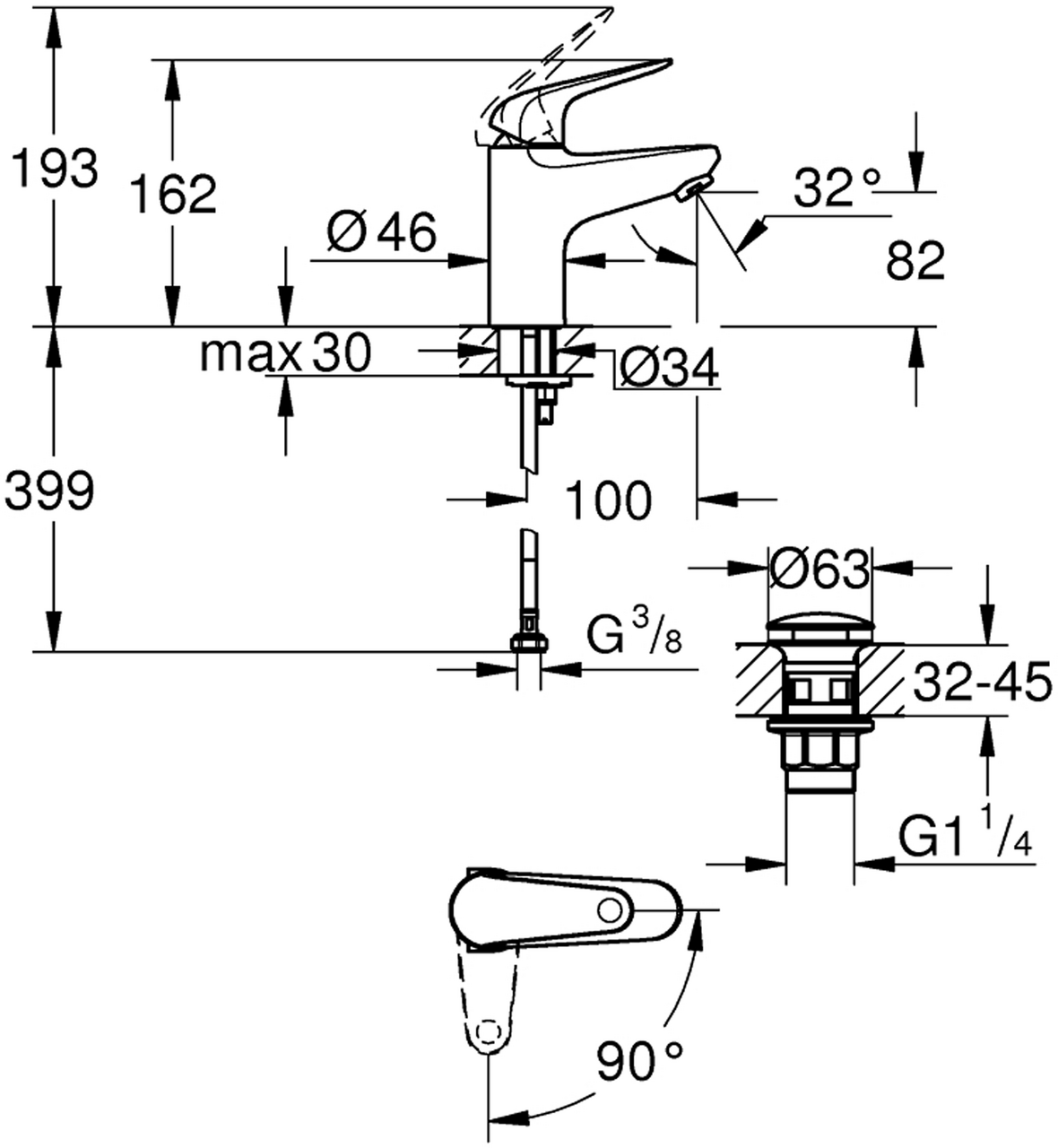 etthullsmontasjemetallhendelGROHE Long-Life ES Kaldstart 28 mm keramisk patron med energisparende funksjon via kaldstartmed temperaturbegrenserGROHE Long-Life overflateinnvendig isolerte vannveier - bly- og nikkelfriGROHE Water Saving-teknologi for mindre vannforbrukrask installasjonglatt kropp med push-up bunnventil i plast, 1/4"fleksible tilkoblingsslangerVann- og avløpsinstallasjoner må installeres av rørlegger.