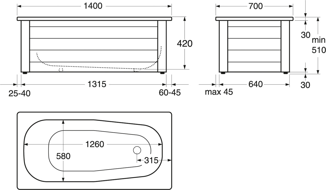 Gustavsberg 1400 badekar u/frontstativ, 1400x700