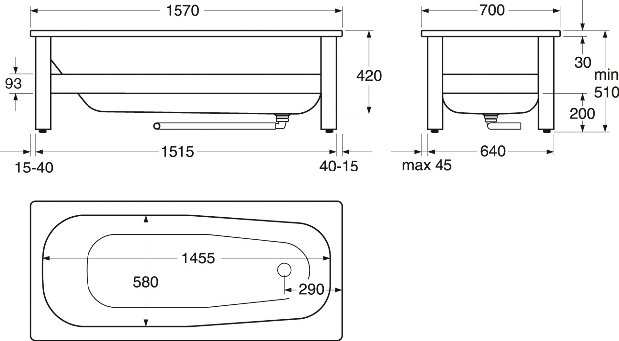 GUSTAVSBERG 1571 BADEKAR U/BENSETT, 1570X700 M/GLAZEPLUS