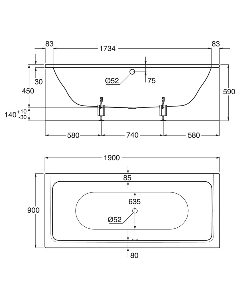 Lengde: 1900 mmHøyde, med ben: 590 mmDybde: 450 mmBredde: 900 mmLeverandørens varenummerGB2086831100