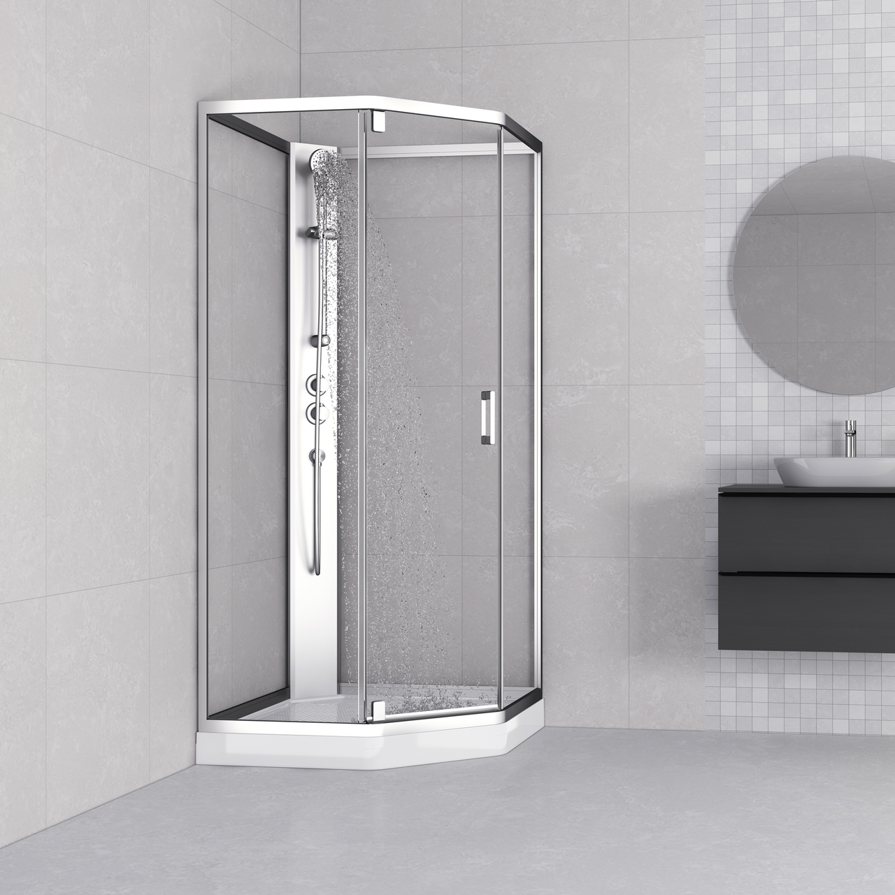 Både frontpanelet og døren kan tas av, noe som gjør rengjøringen av dusjkabinettet enklere. Det avrundede hjørnet gjør at kabinettet tar mindre plass. Bunnkaret har justerbare ben, som gjør at du kan justere for fall på baderomsgulvet.