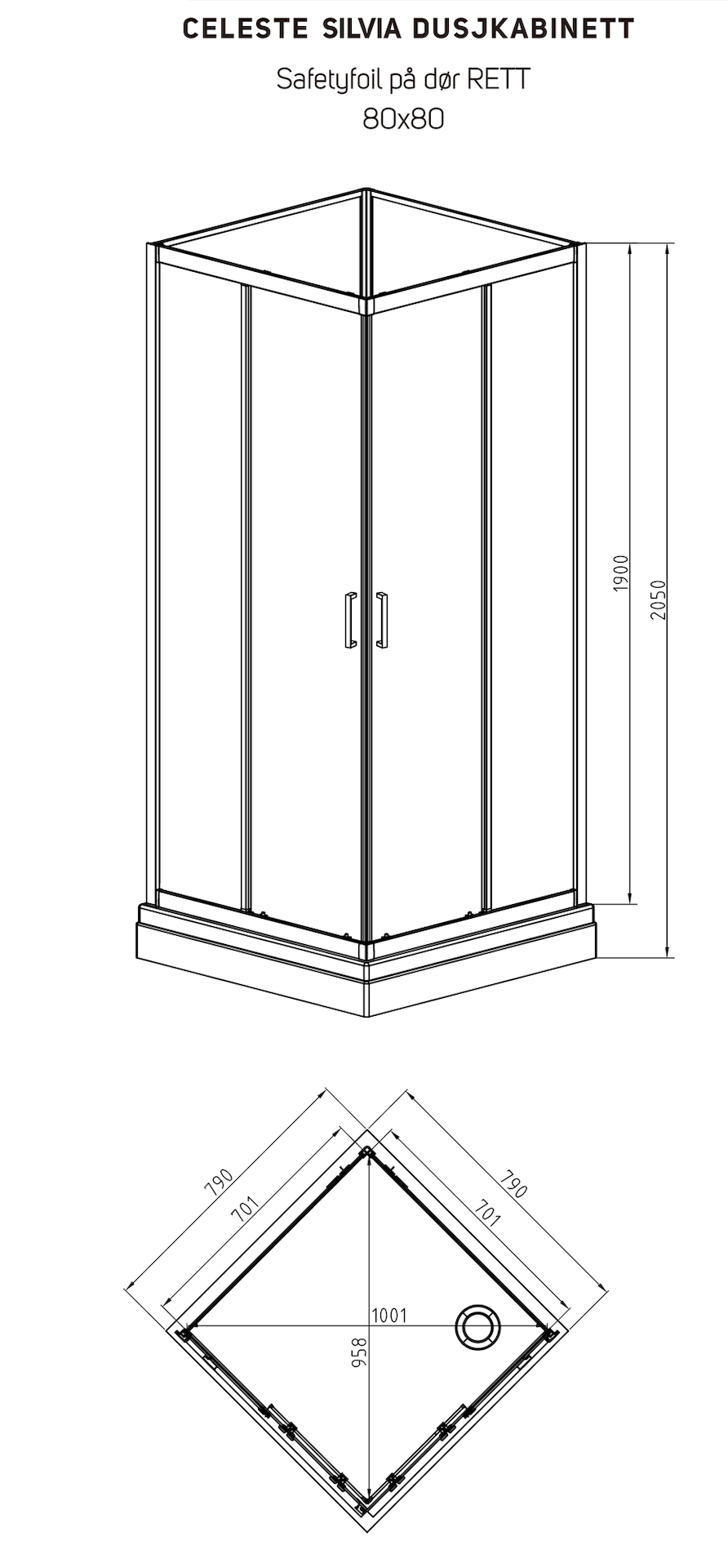CELESTE SILVIA RETT DUSJKABINETT 80X80X205 CM M/SIKKERHETSFOLIE, KROM