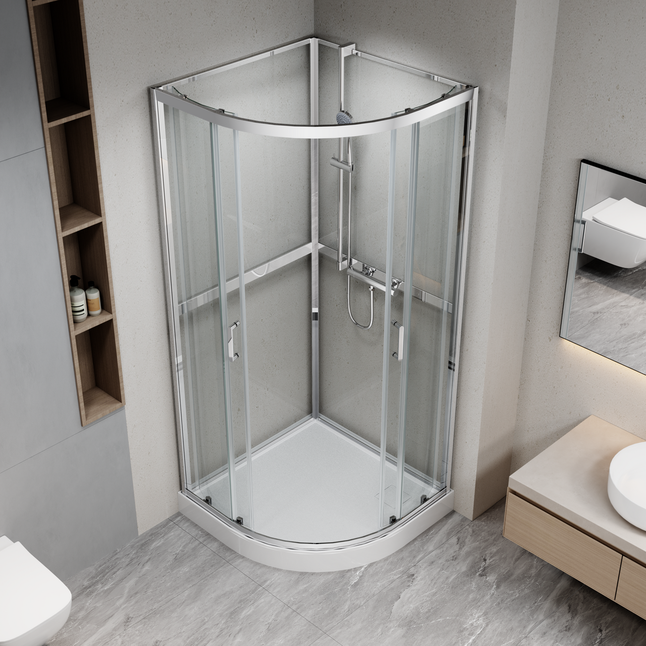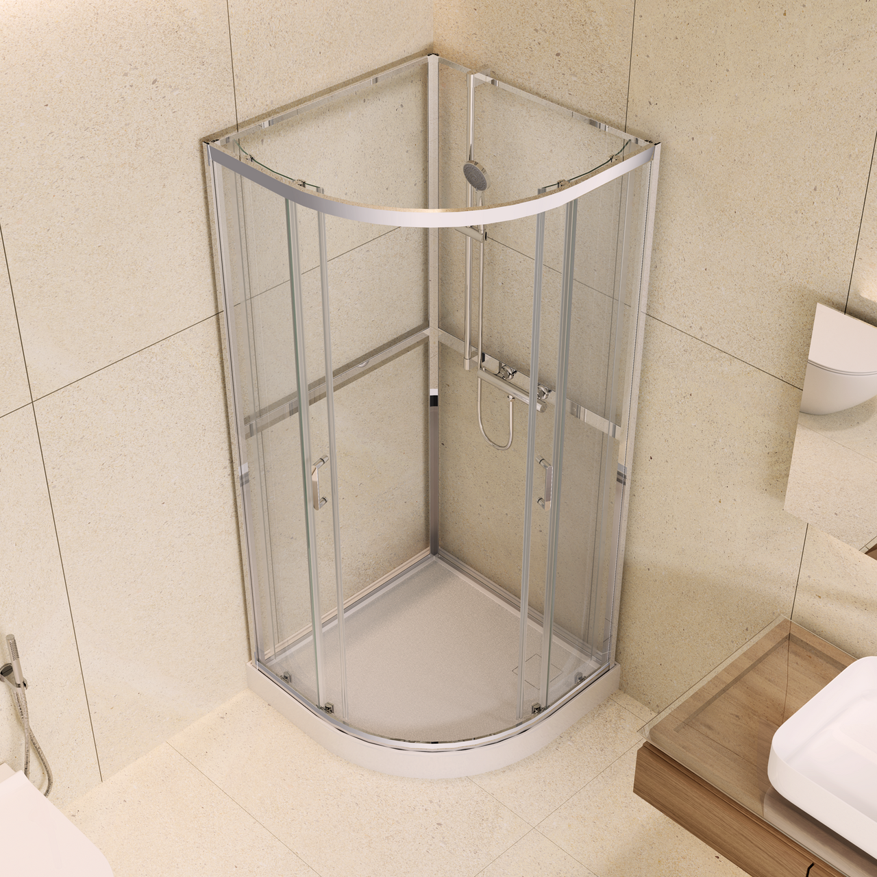 Dusjkabinettet er utstyrt med skyvedører med doble hjul for jevn og stabil åpning. Det leveres komplett med dusjkar og hånddusj med 3 funksjoner.