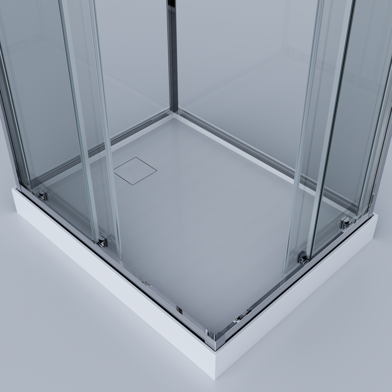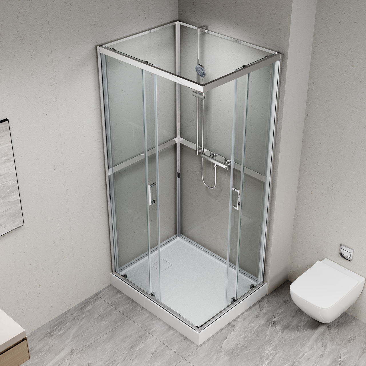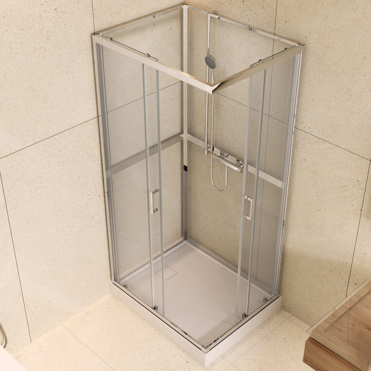 Skyvedøren er laget av 5 mm tykt herdet glass med sikkerhetsfolie. Skulle glasset knuse, vil folien holde glassbitene på plass og hindre at de faller utover gulvet. Bakpanelet er laget av 4 mm tykt glass og har også sikkerhetsfolie. Du kan selv velge hvilken side i hjørnet dusjsettet og blandebatteriet skal monteres.