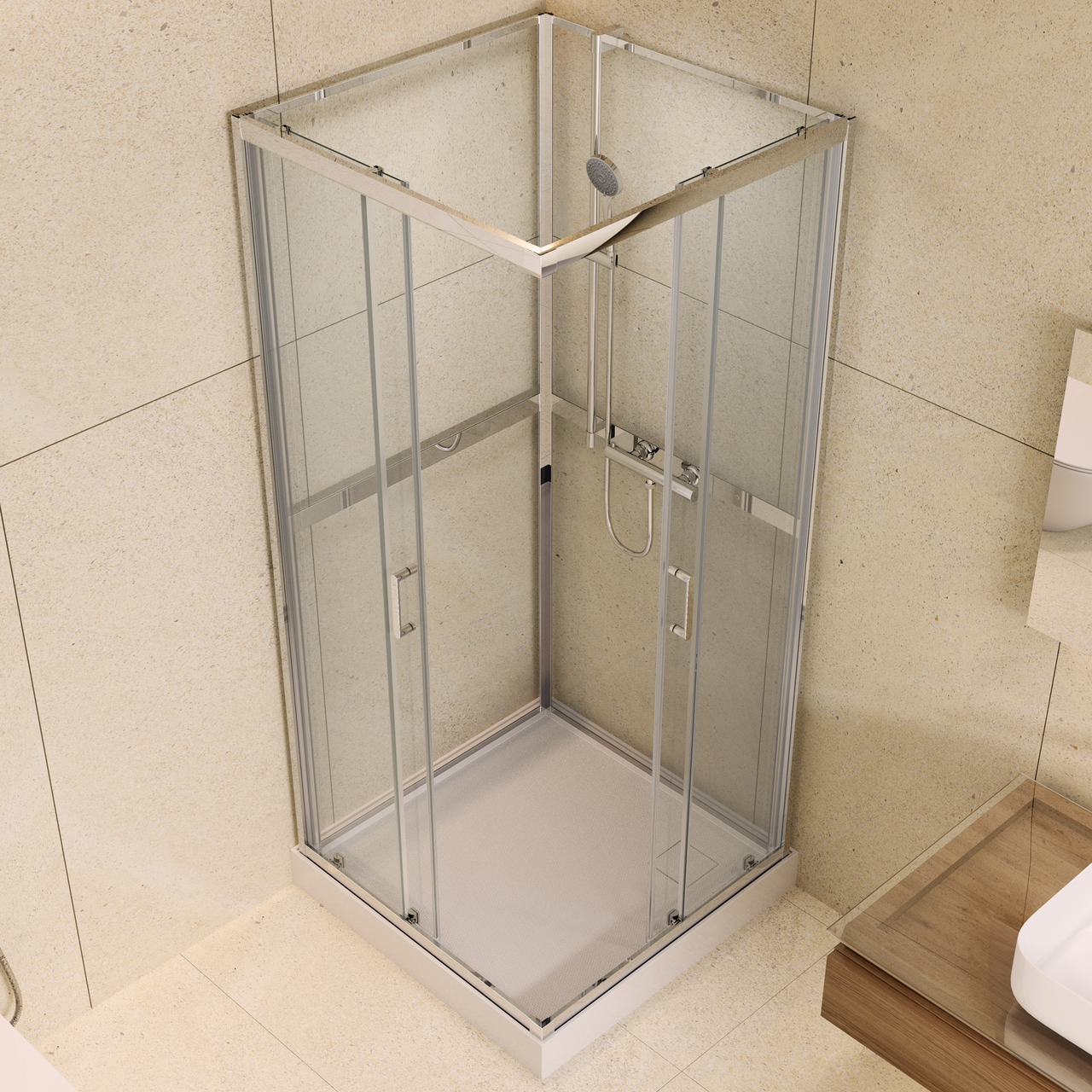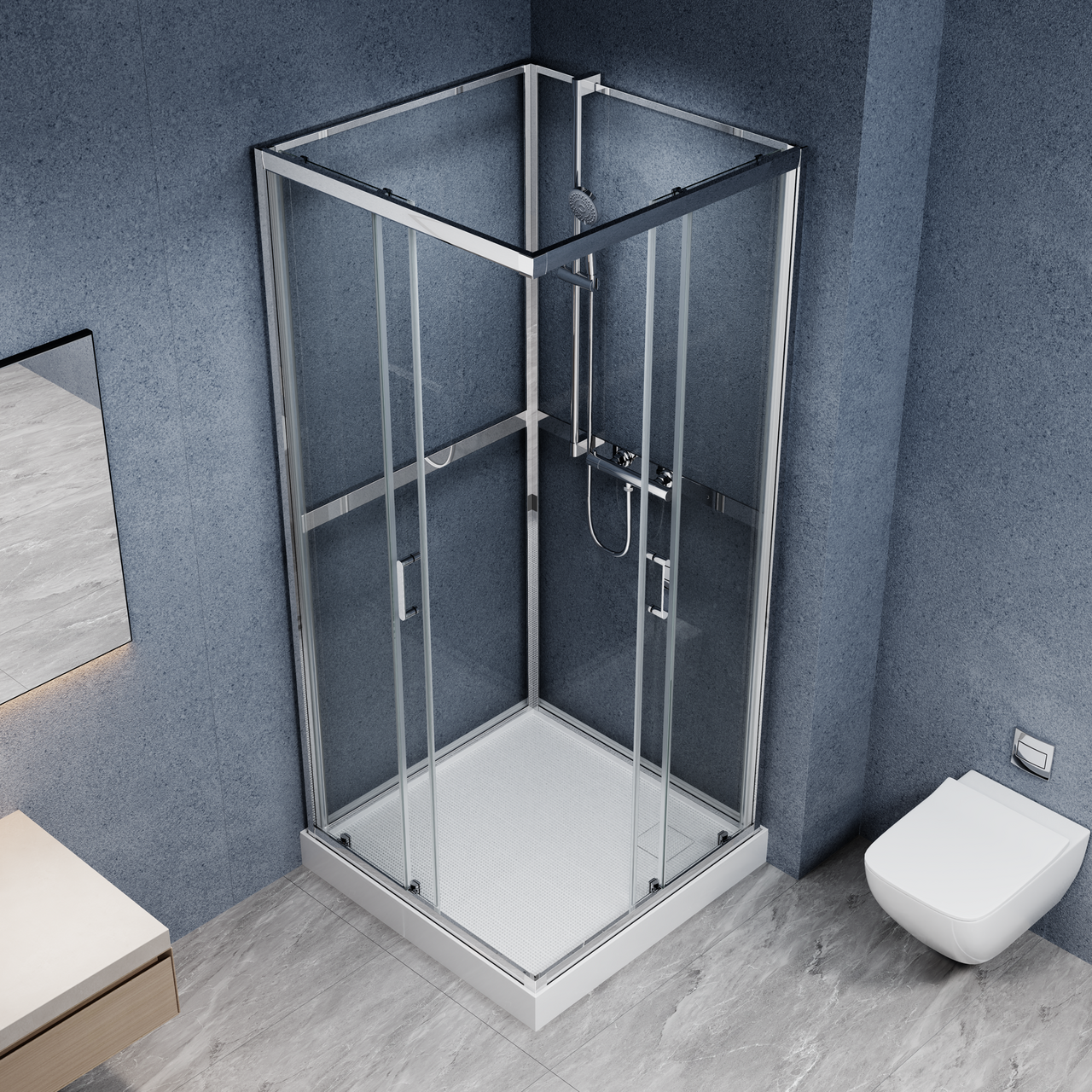 Skyvedøren er laget av 5 mm tykt herdet glass med sikkerhetsfolie. Skulle glasset knuse, vil folien holde glassbitene på plass og hindre at de faller utover gulvet. Bakpanelet er laget av 4 mm tykt glass og har også sikkerhetsfolie. Du kan selv velge hvilken side i hjørnet dusjsettet og blandebatteriet skal monteres.