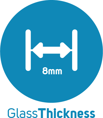 Fronten er laget i 8 mm tykt herdet glass, med en sikkerhetsfolie som gjør at om du skulle være så uheldig at glasset knuser, vil sikkerhetsfolien holde glassbitene på plass og sikre at de ikke faller utover gulvet.