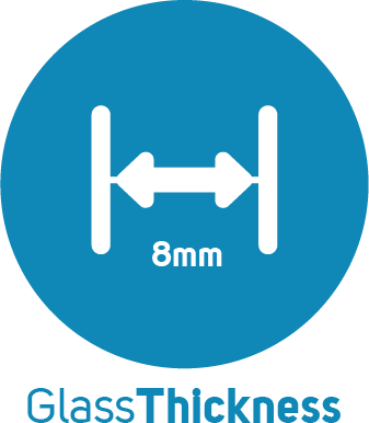 Fronten er laget i 8 mm tykt herdet glass, med en sikkerhetsfolie som gjør at om du skulle være så uheldig at glasset knuser, vil sikkerhetsfolien holde glassbitene på plass og sikre at de ikke faller utover gulvet.