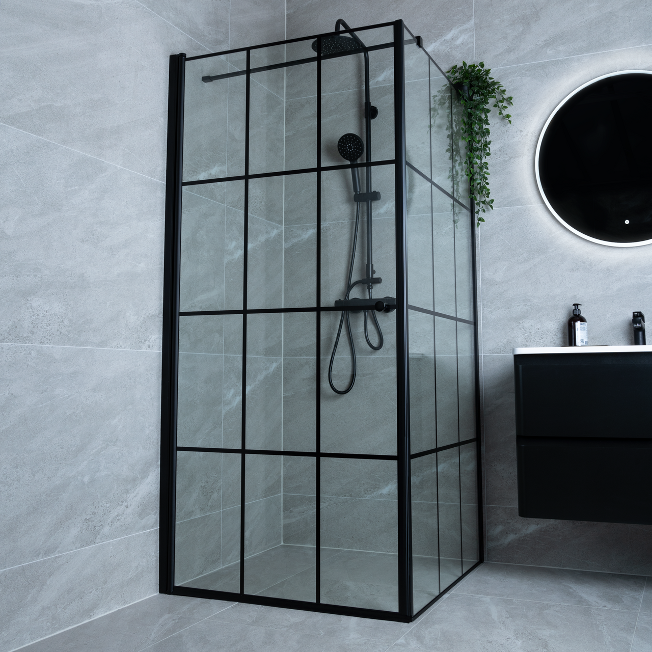 Denne dusjdøren er en del av den moderne Nero-serien fra Celeste. Den er 90 cm bred, og har et stilrent design med rutete mønster og sorte profiler. Den passer godt inn i både mørke og lyse baderom, og et dusjsett i samme farge vil skape en helhetlig stil.