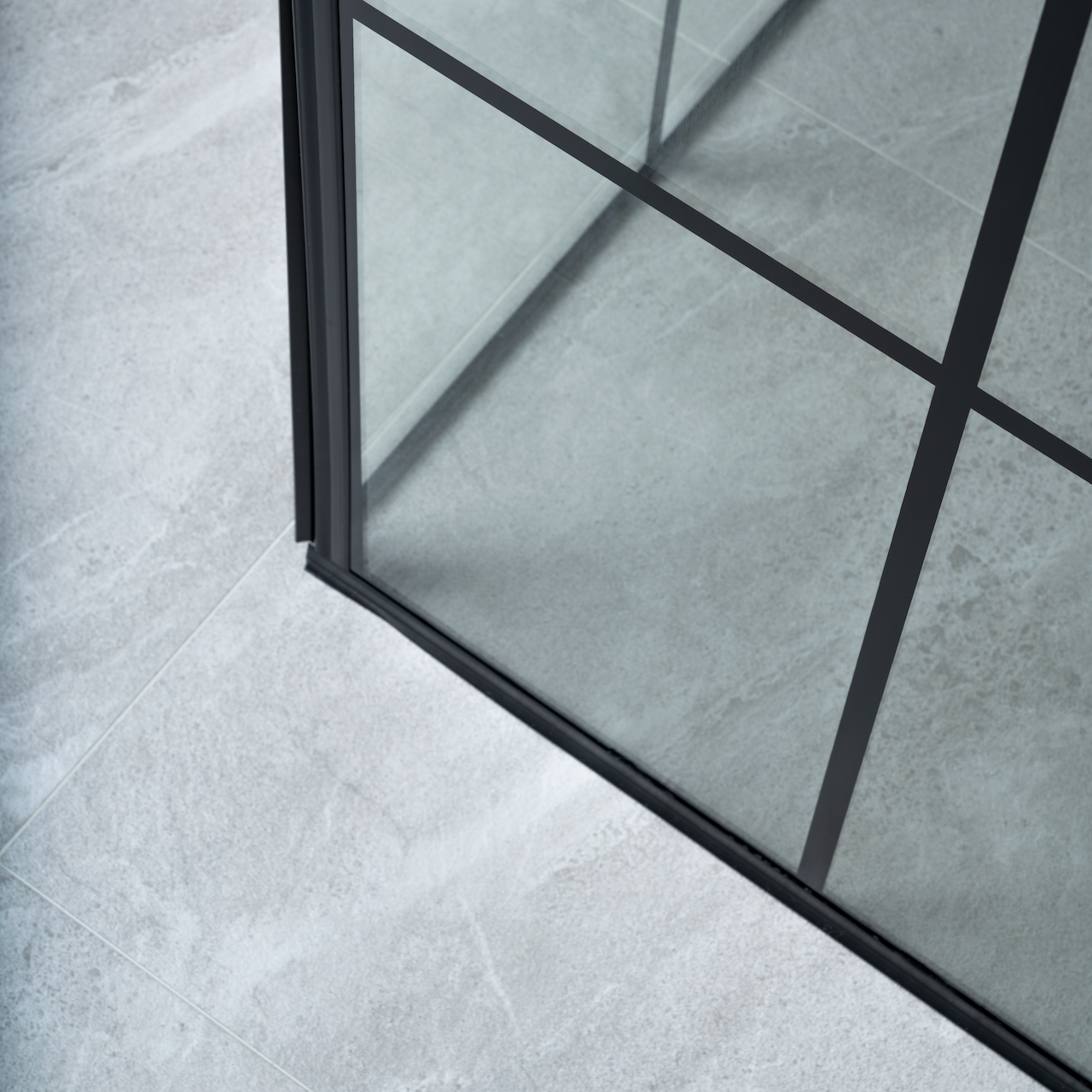 Dusjdøren kan enkelt kombineres med en dør eller fast dusjvegg i samme serie. Den er laget i 6 mm tykt herdet glass, med en sikkerhetsfolie som gjør at om du skulle være så uheldig at glasset knuser, vil sikkerhetsfolien holde glassbitene på plass og sikre at de ikke faller utover gulvet. Sprossene på dusjdøren er lakkert på før glasset er satt til herding, slik at rengjøringen blir enklere.