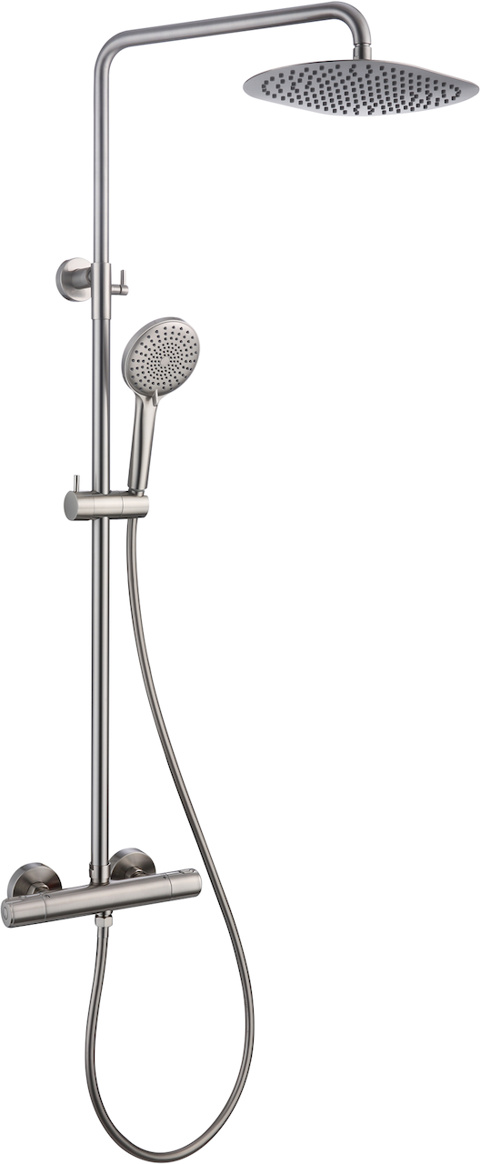 Høyden på takdusjen kan justeres, og i tillegg til takdusjen følger det med en hånddusj med 3 innstillinger. Dusjtermostat er også inkludert, og med termostaten kan du enkelt justere temperaturen og veksle mellom hånddusj og takdusj.