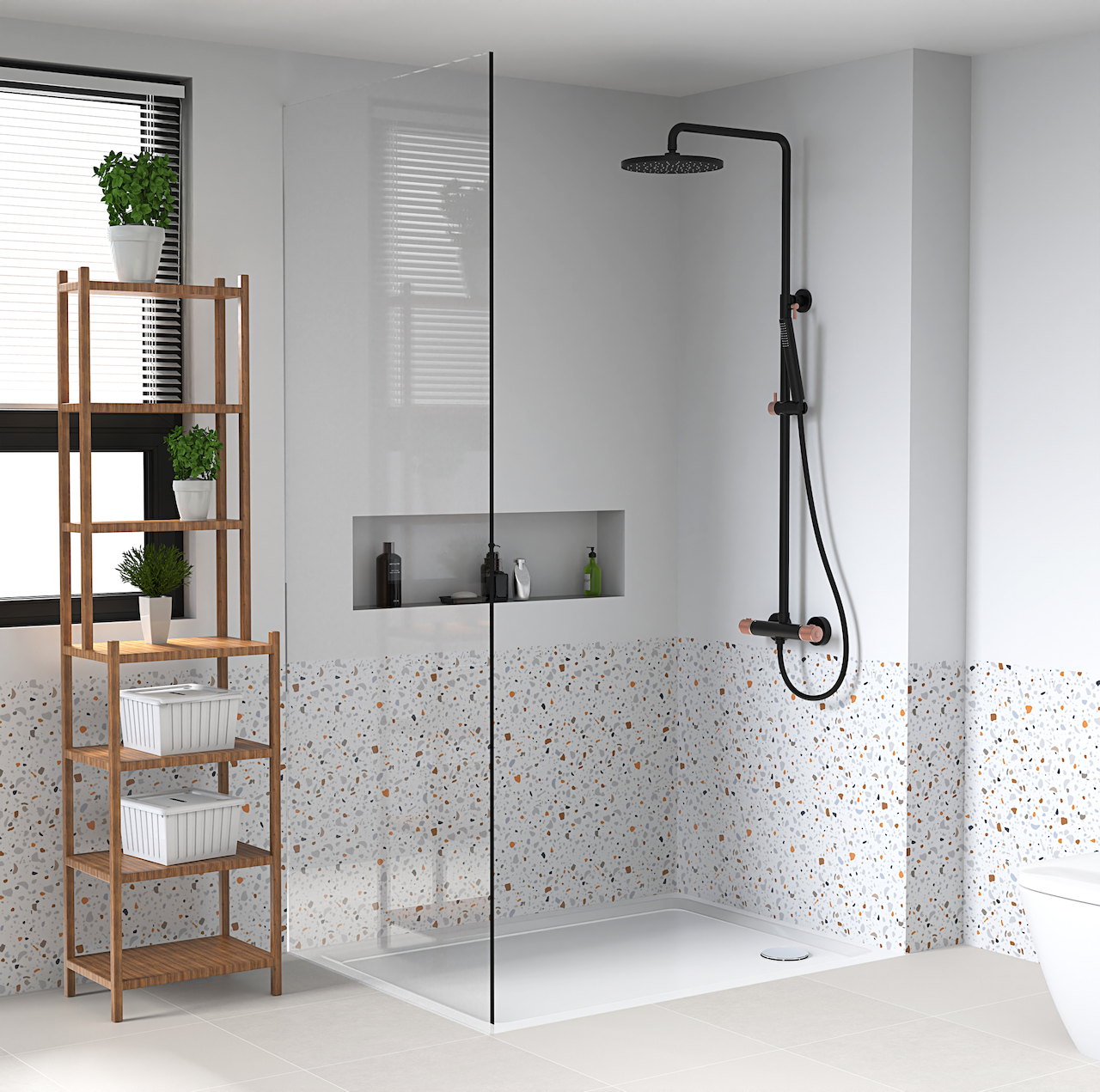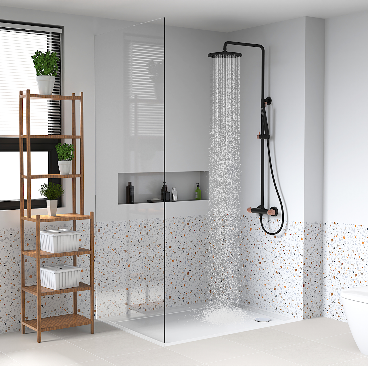 Dusjsettet Wakefield fra Celeste har et moderne og elegant design, og kommer i matt sort med detaljer i kobberfarge. Den runde takdusjen skaper en følelse av hjemmespa, med en behagelig regnfallsdusj.