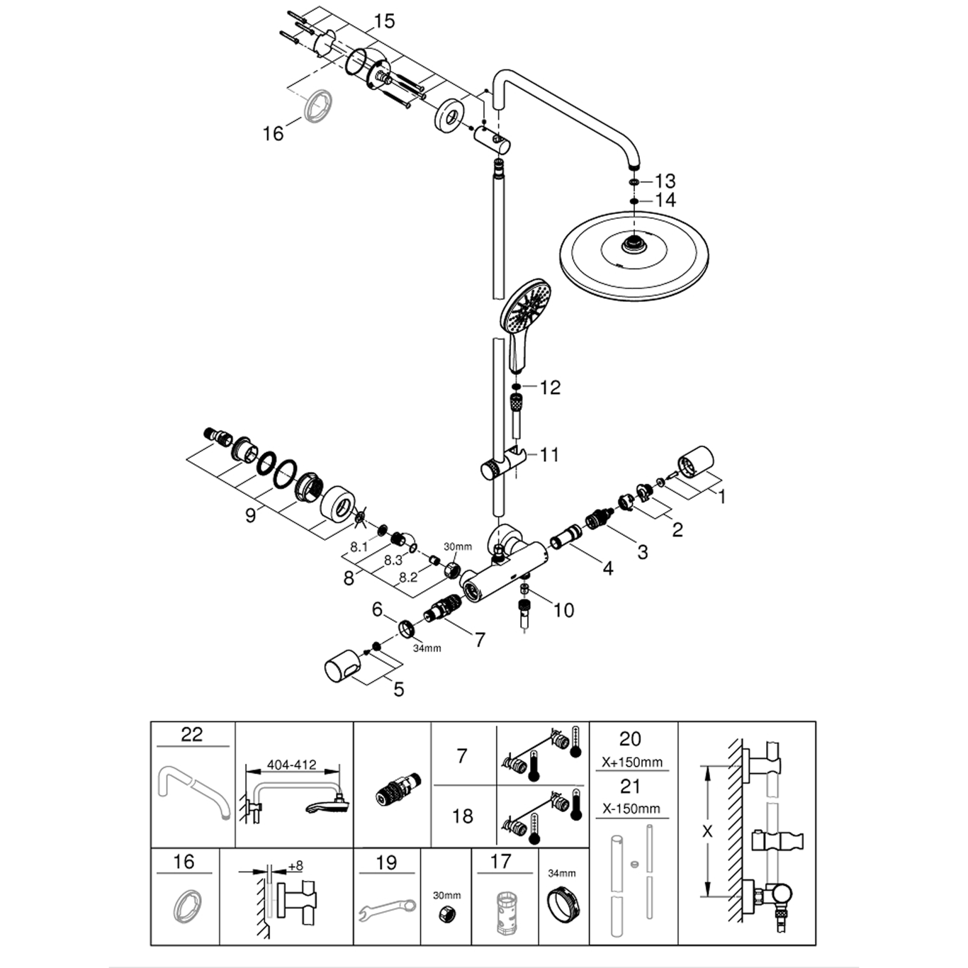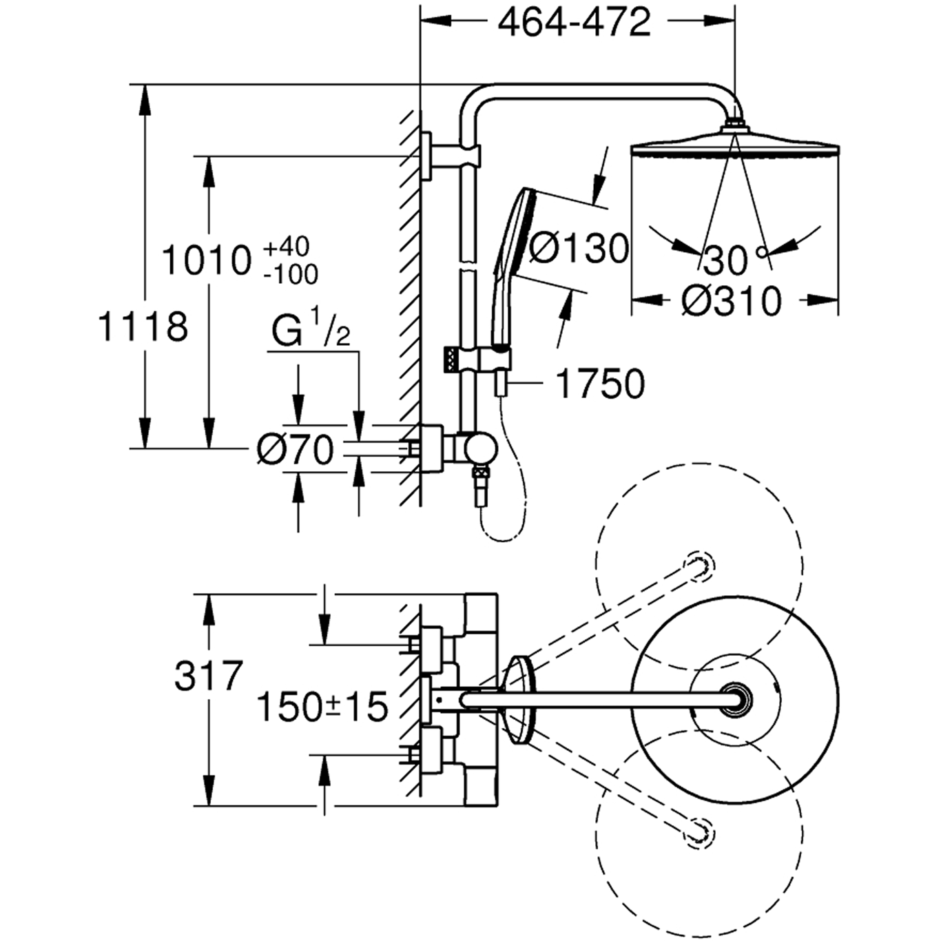 består av:vannrett svingbar 450 mm dusjarmtermostat med Aquadimmer-funksjonmuliggjør skift mellom:hodedusj Rainshower Mono 310 (26 561)med kuleleddrotasjonsvinkel ± 15°Rainshower SmartActive 130 hånddusj (26 544)justerbar i høyde m/glideelementinkludert ytelsesgrepSilverflex dusjslange 1750 mm(28 388 000)GROHE TurboStat kompakt patronmed voks termoelementGROHE SafeStop ved 38°CGROHE SafeStop Plus valgfri temperaturbegrensning på 43°C inkludertGROHE CoolTouch ingen fare for skåldingGROHE DreamSpray perfekt strålemønsterGROHE One-Click dusj spray valgmed ett klikkGROHE Long-Life Shine overflateGROHE FastFixation øvre feste er justerbartSpeedClean antikalksystemegnet til gjennomstrømsvarmerfra 18 kW/hminimumsmengde 7 l/min.Vann- og avløpsinstallasjoner må installeres av rørlegger.
