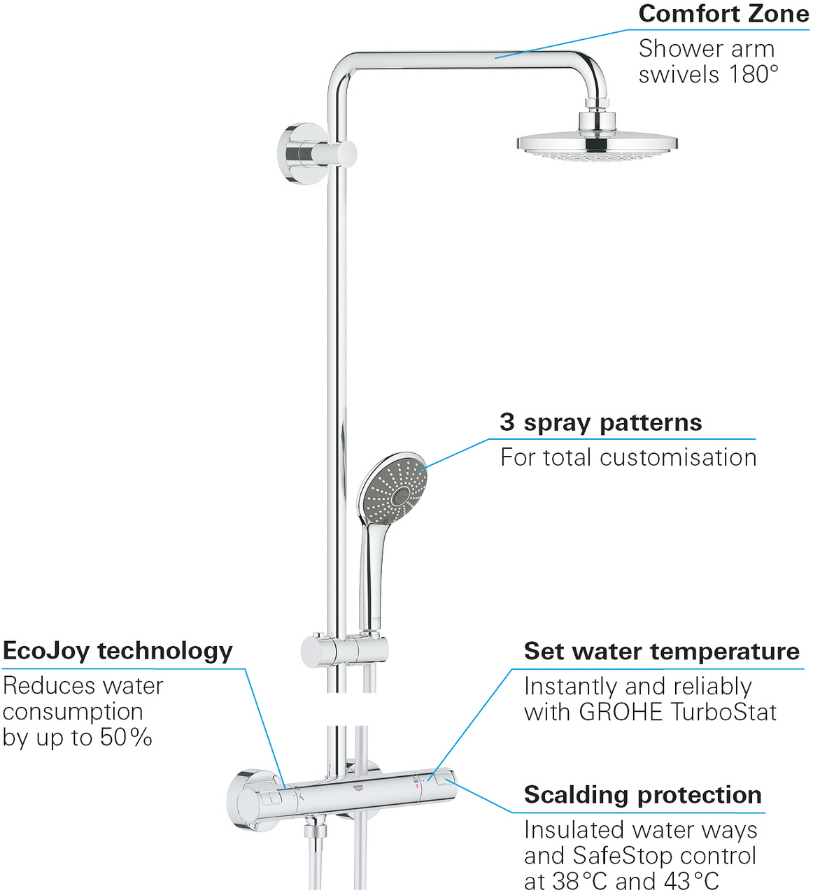 Det skal være deilig å dusje. Det er filosofien bak GROHE Vitalio Joy 180 dusjsystem med termostat. Den er full av fleksible funksjoner, har fantastisk design som forbedrer ethvert moderne baderom, og GROHE watersaving begrenser vannforbruket til 9,5 l/min uten å gå på kompromiss med ytelsen. Skyll vegg dagens stress under den 180 mm store hodedusjens supermyke strålemønster Rain. I tillegg har hånddusjen Vitalio Joy 110 mm tre forskjellige strålemønster. Velg mellom den skånsomme Rain Spray, vannbesparende SmartRain og revitaliserende Massage Spray. GROHE TurboStat-teknologi garanterer uendret temperatur uten uønskede svingninger, og GROHE DreamSpray sørger for at det kommer like mye vann fra hver eneste dyse. GROHE AquaDimmer gjør det enkelt å justere vannmengden og å veksle mellom hode- og hånddusj, mens GROHE DropStop-funksjonen sørger for at dusjen ikke drypper når du er ferdig. Den har også den familievennlige GROHE SafeStop-knappen som kan begrense temperaturen til 38 °C for å forhindre skålding, samt Inner Waterguide som sørger for at dusjens overflaten aldri blir for varm. SpeedClean-silikondysene er enkle å rengjøre, du kan enkelt fjerne kalkbelegg med fingrene. Den skinnende blanke GROHE StarLight kromfinishen er en ripesikker overflate som beholder glansen i mange år.