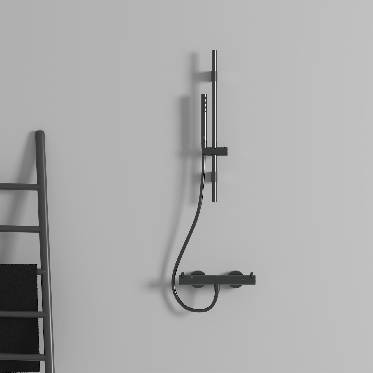 Dette dusjsettet fra Ideal Standard har et elegant design, og den matte overflaten i mørk grå bidrar til et moderne uttrykk på badet.