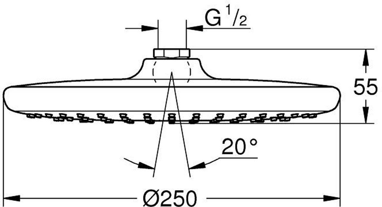 Rainmaximum flow rate (at 3 bar): 8.5 l/minØ 250 mmHodedusj med hvitt dekselkuleledd med styrevinkel ± 10°tilslutningsgjenger 1/2"GROHE Water Saving-teknologi for mindre vannforbrukGROHE DreamSpray perfekt strålemønsterGROHE Long-Life overflateSpeedClean antikalksystemIndre WaterGuide for lengre levetidvelegnet til gjennomstrømsvarmermin. trykk 1.0 barLeverandørens varenummer26676000