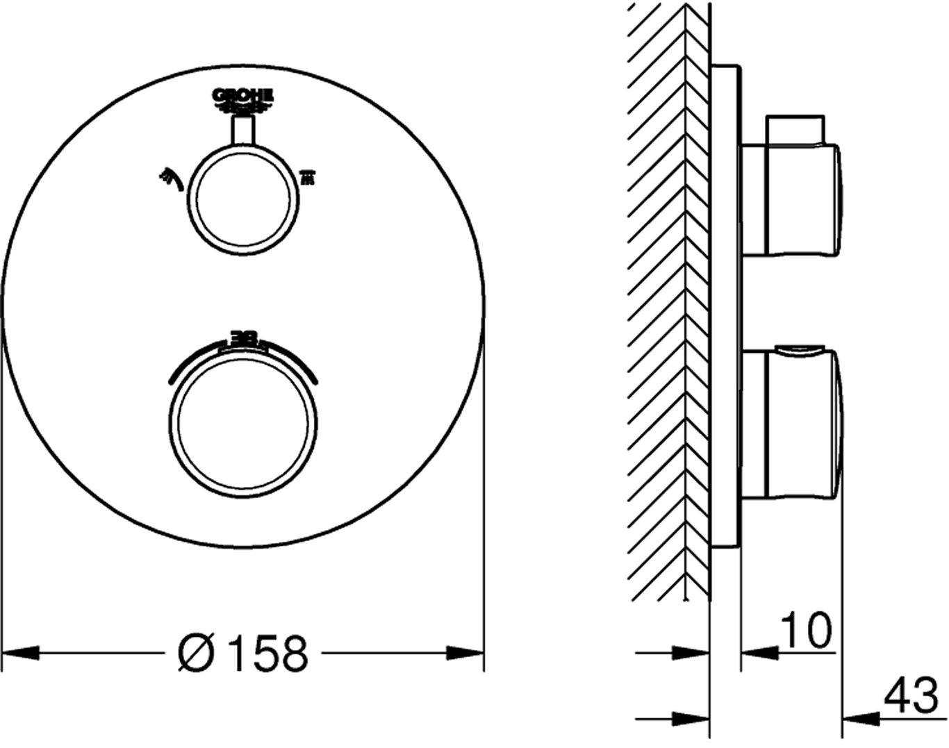 tilhørende innvendig del:GROHE Rapido SmartBox 35 600/35 604GROHE TurboStat kompakt patronmed voks termoelementGROHE StarLight krom overflatedekkskive med GROHE FastFixation(dekket rosett- og akseltetning, skjult feste)metall rosett, med tilbakevirkende kraft 6° justerbarprintet hode- og hånddusj symbolerGROHE SafeStop ved 38°CGROHE SafeStop Plus valgfri temperaturbegrensning på 43°C / 46°C inkludertGROHE AquaDimmer, integrert omskifter/avstegningsventilflyt ytelse: utløp B = 27 l/min, utløp C = 30 l/minuten rørsettVann- og avløpsinstallasjoner må installeres av rørlegger.