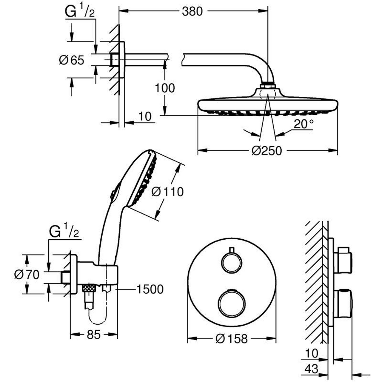 Hodedusj diameter: 250 mmDusjarm lengde: 380 mmHånddusj diameter: 110 mmDusjslange lengde: 1500 mmVannforbruk (maks): 9,5 l/minTemperaturbegrensning (SafeStop): 38 °CEkstra temperaturgrense (SafeStop Plus): 43 °C eller 46 °CGjenger: 1/2" utvendigeInkludert: dusjholder med uttak og TwistStop-slangeKompatibilitet: GROHE Rapido Shower Frame Duo (1039939990)Merk: GROHE Rapido SmartBox (35604000) følger ikke medVann- og avløpsinstallasjoner må installeres av rørlegger.