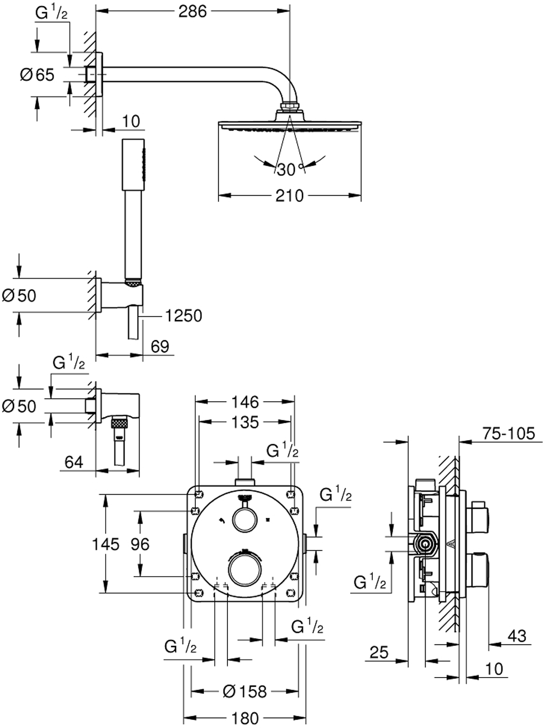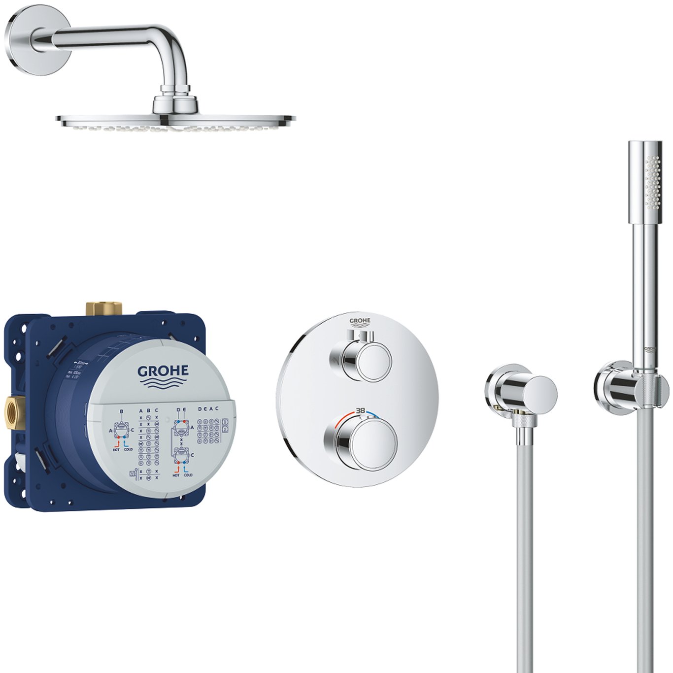 består av:Grohtherm dusjsett med Aquadimmer (24 076)GROHE Rapido SmartBox 35 600/35 604Rainshower Cosmopolitan 210 metal head shower (28 373)Rainshower dusjarm 286 mm (28 576)hånddusj Sena (28 034 000)Rainshower veggholder (27 074 000)Rainshower veggtillslutning (27 057 000)Silverflex dusjslange 1250 mm (28 362)Vann- og avløpsinstallasjoner må installeres av rørlegger.