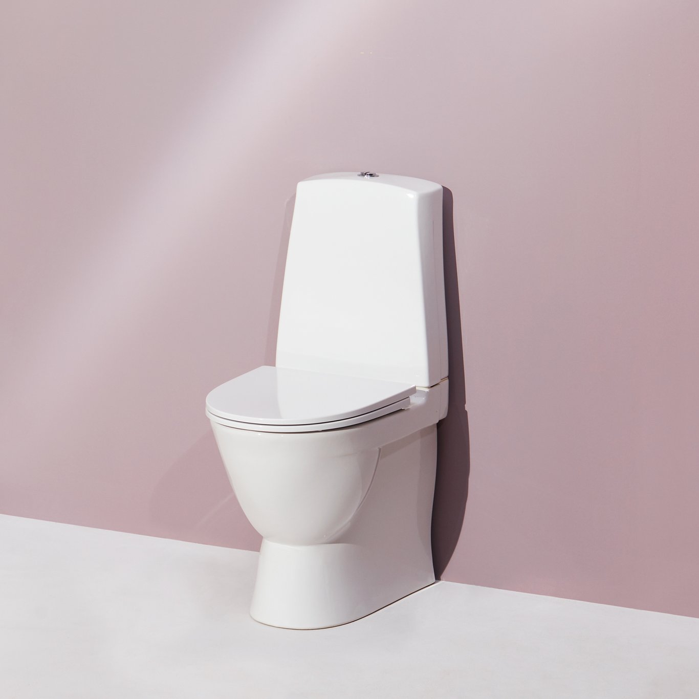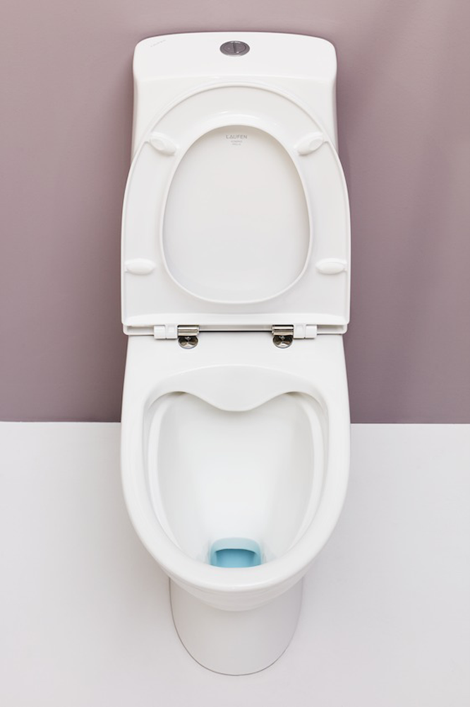 Dette gulvstående toalettet fra Laufen har et klassisk design, og monteres helt inntil veggen for enklere renhold.