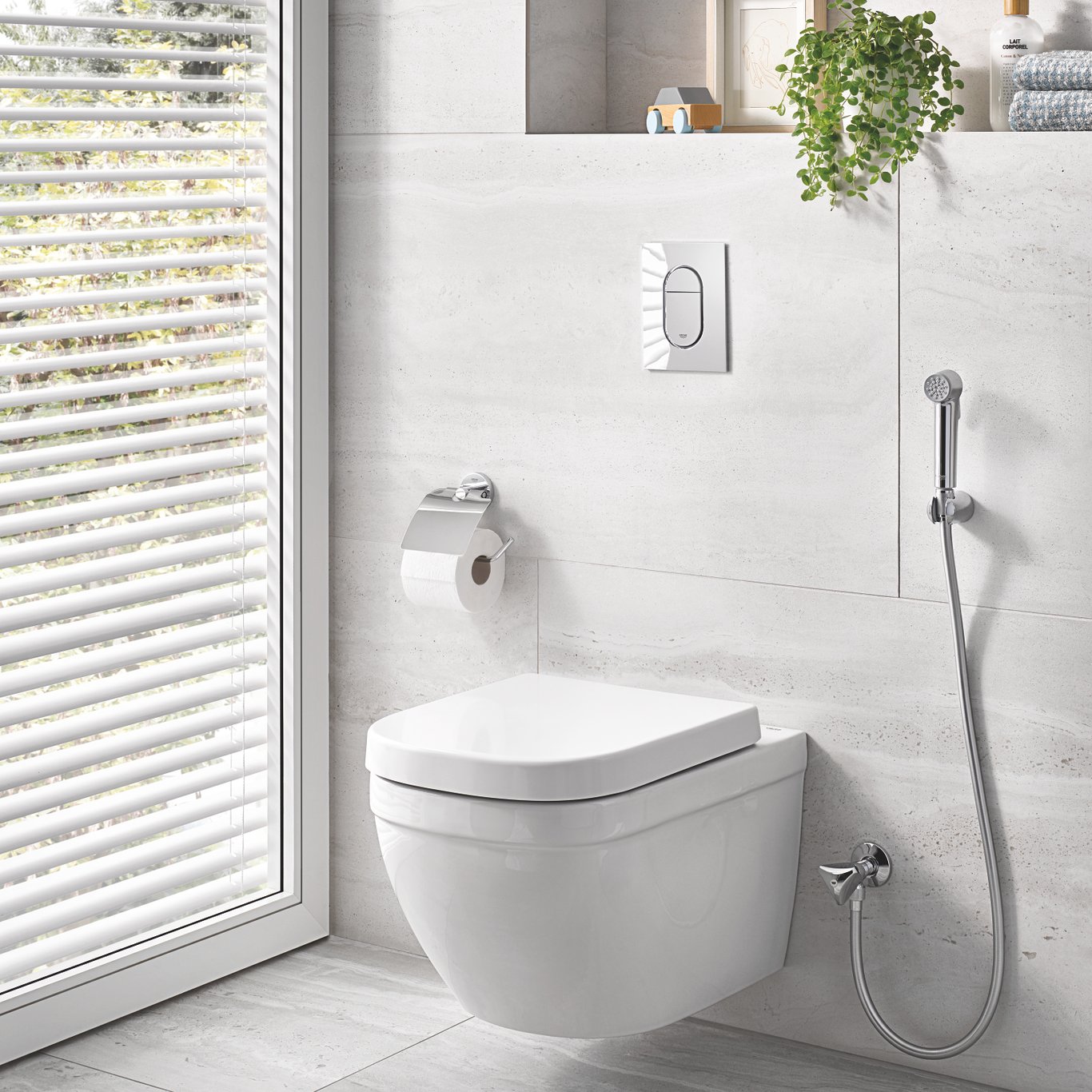 Denne trykkplaten fra Grohe har et stilrent design, og et slitesterkt belegg som er enkelt å holde rent. Trykkplaten er mindre enn vanlige trykkplater, og monteres loddrett.