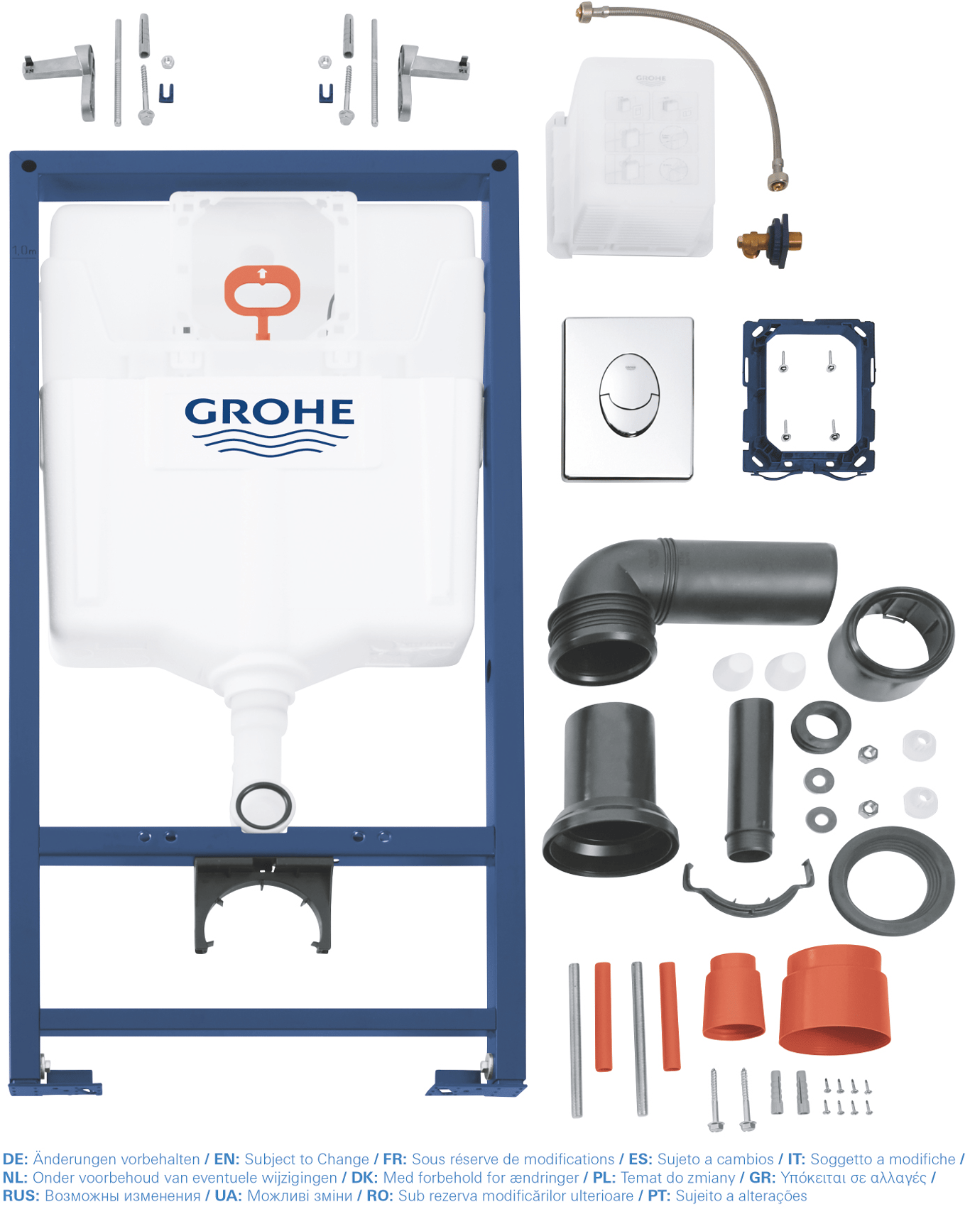 Du kan stole på GROHE Rapid SL 3-in-1 installasjonssett for veggmonterte toaletter. Selv monteringen er enkel, og den smarte støydempingen er en ekstra bonus. Stålrammen er sertifisert for å tåle belastning på over 400 kg for ultimat stabilitet, og den kan monteres foran en solid vegg eller inne i lettvegger på et blunk takket være GROHE QuickFix-systemet med ToolFree-funksjon, som gjør at du ikke trenger å bruke verktøy for å koble til slange, inspeksjonsåpning og vanntilførsel. GROHE watersaving dobbeltspylesystemet er bedre for miljøet og reduserer vannforbruket med inntil 50 %. Støyoverføring til bygningen holdes til et minimum takket være GROHE Whisper-teknologien, som er utformet med støydempende fester og separate rør. Settet leveres komplett med veggfester og en elegant Skate Cosmopolitan spyleplate i krom.