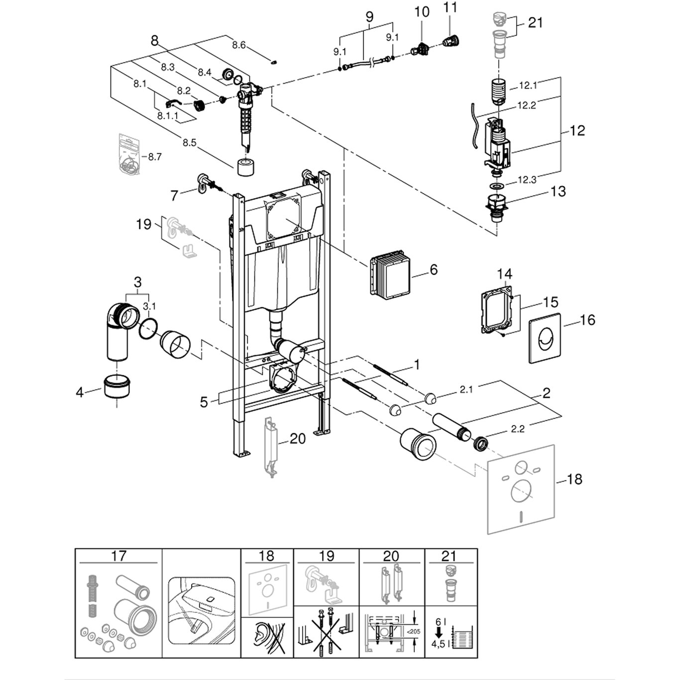 med sisterne GD 2, 6 - 9 l1130 mm konstruksjonshøydetil forveggs- eller elementmontasjestålramme, pulverlakert, selvbærendetil tørrbekledningfastmonterte objekttilkoblingermed hurtig innstilling og sikringfestemateriale2 WC-bolterkeramisk festeboltavstand 180/230 mmavløpsbend DN 90 mmjusterbarredusering Ø 90/110 mmtil- og avløpsgarnityrsisterne GD 2, 6 - 9 ljusterbar ex fabrikk 6 l og 3 lpneumatisk avløpsventil med 3 funksjoner:hel- og halv spyling, start & stopp ellerhel spylingvanntilslutning fra venstre, høyre eller oppearmaturgruppe l, under 20 dBkondensvannisolerthjørneventil DN 15med slangekobling uten bruk av verktøybruk av verktøy er ikke nødvendig ved montering av inspeksjonslukenfor vertikal eller horisonal montasje2 veggvinkler med festematerialevanninngang med 25 mm rørgjennomføringmed betjeningsplate Skate Airtil loddrett og vannrett montering156 x 197 mmav ABSkrominkludert Skandinavisk adapter 38 338 000Leverandørens varenummer38988000