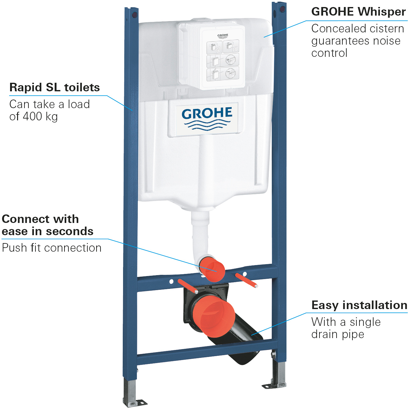 - GROHE Whisper® støykontroll gir minimal lydoverføring til rom som ligger vegg i vegg.