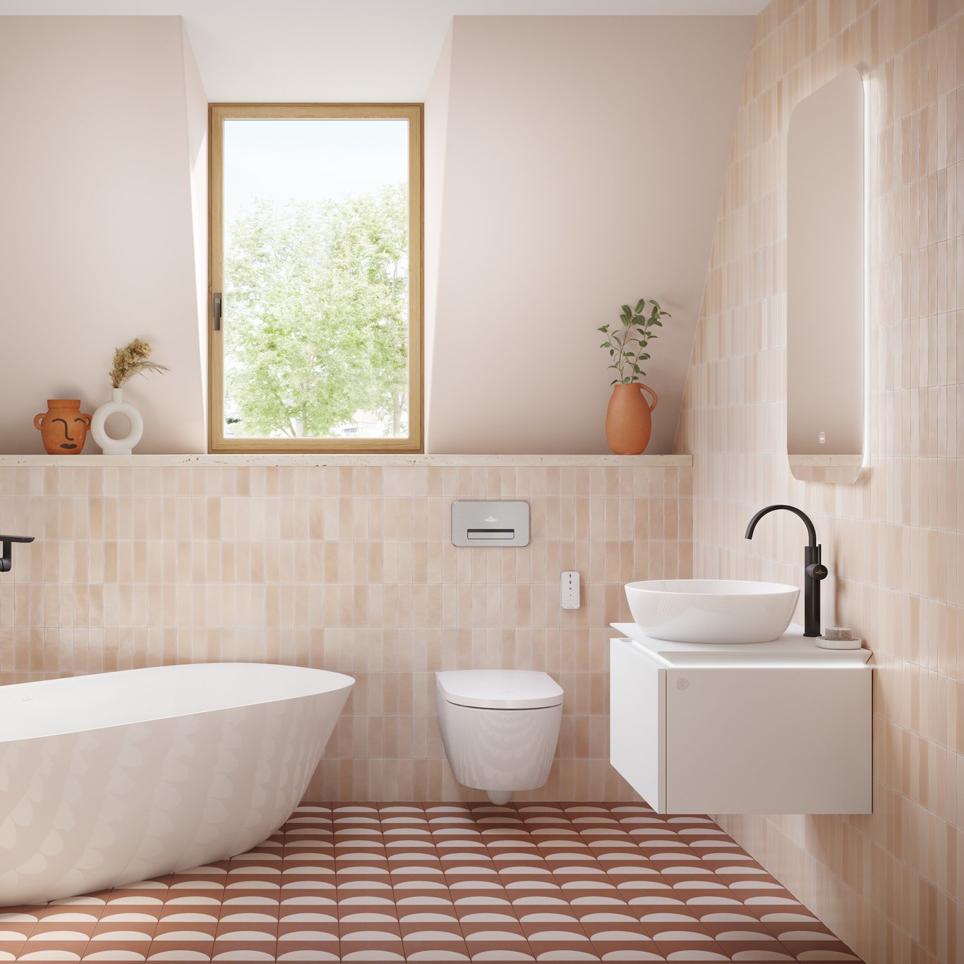Denne sensorstyrte trykkplaten fra Villeroy & Boch har et moderne og minimalistisk design, og kommer med vannbesparende dobbelspyling.