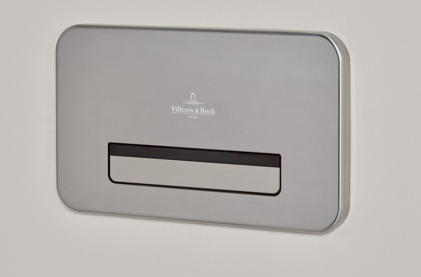 Denne sensorstyrte trykkplaten fra Villeroy & Boch har et moderne og minimalistisk design, og kommer med vannbesparende dobbelspyling.