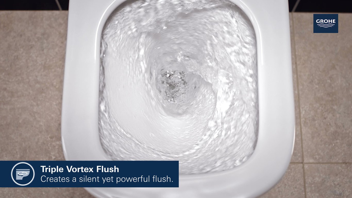 Grohe Triple Vortex skaper en kraftig, men stille, virvel av vann som rengjør hele skålen. Denne spyleteknologien har lavt vannforbruk, med to skyllealternativer. Triple Vortex-teknologien spyler fra tre uttak for å skape et kraftfullt sug som ikke etterlater seg noe.