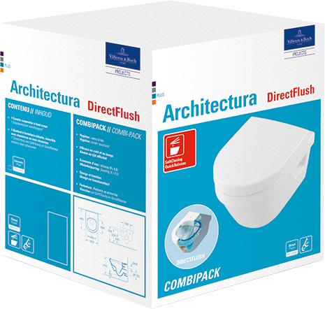 Architectura Omnia fra Villeroy & Boch er et sett bestående av en kompakt veggskål med åpen spylekant og toalettsete med demping. Setet er avtagbart for et enkelt og effektivt renhold.