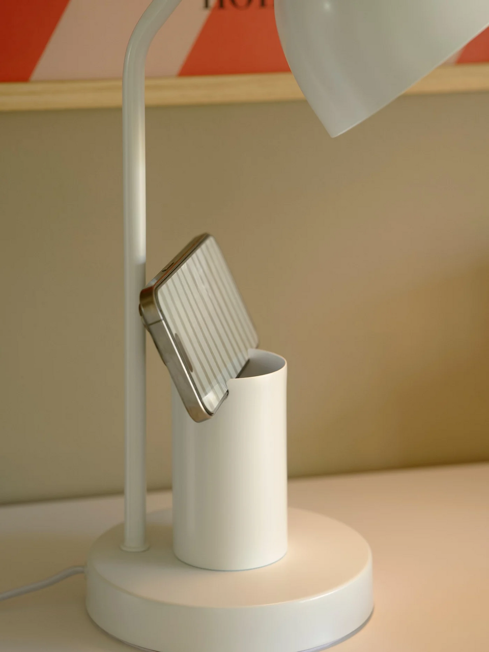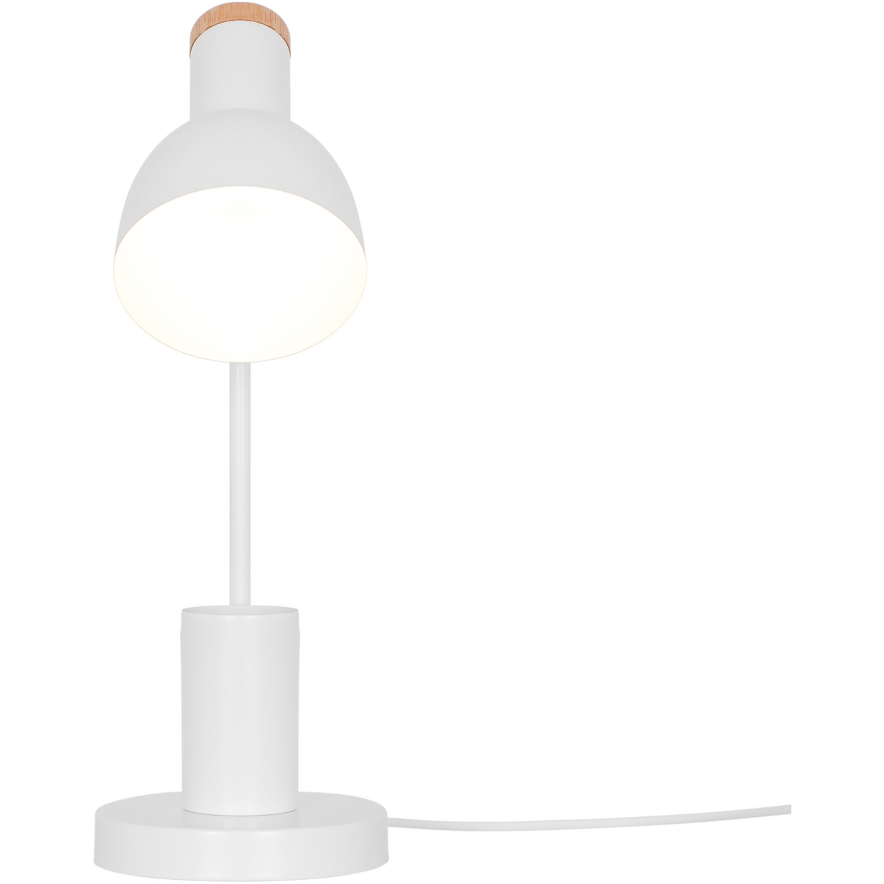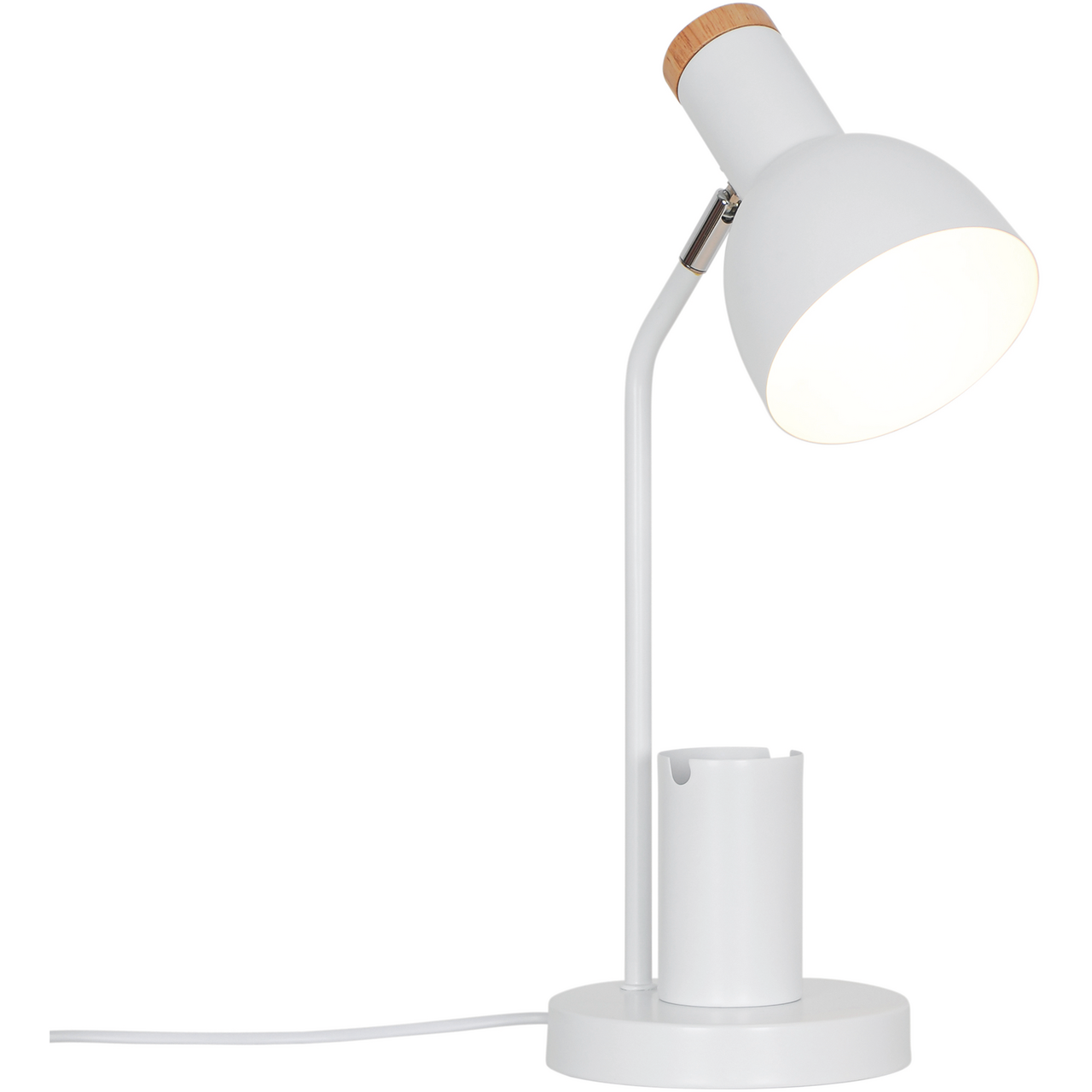 Bordlampen kombinerer tre og metall i et lekent, moderne design. Lampen har innebygd oppbevaring til blyanter eller annet smått, og kan også fungere som holder til telefon. Det gjør den til et funksjonelt valg på skrivebord, nattbord eller arbeidsplass på barnerommet.