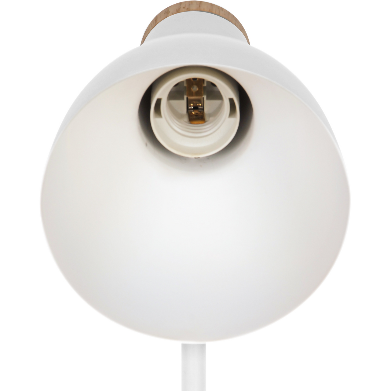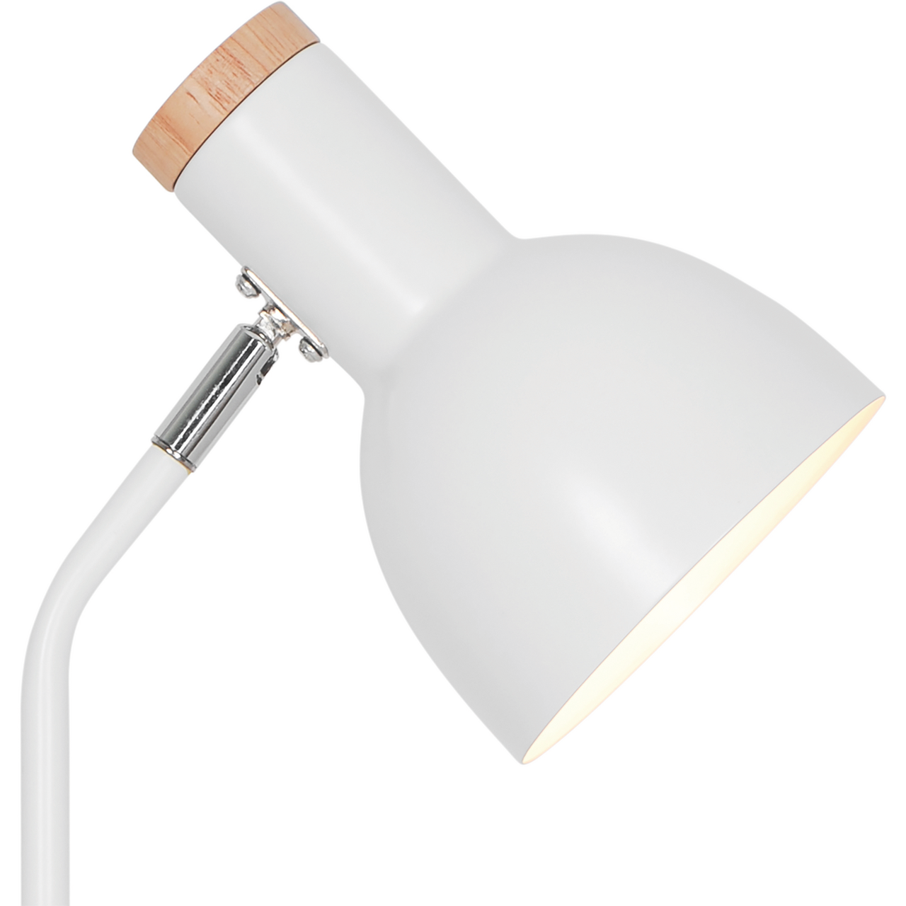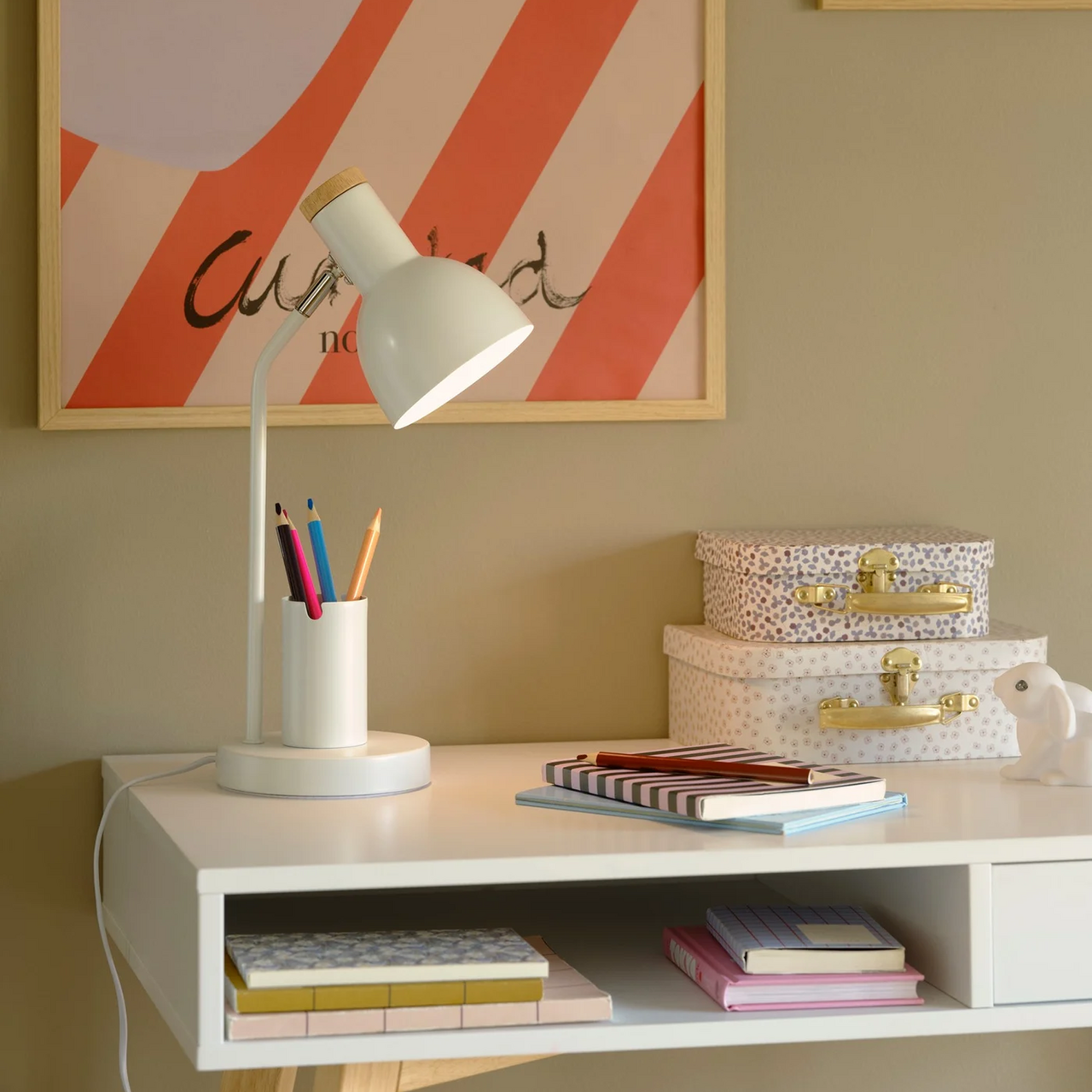 Bordlampen kombinerer tre og metall i et lekent, moderne design. Lampen har innebygd oppbevaring til blyanter eller annet smått, og kan også fungere som holder til telefon. Det gjør den til et funksjonelt valg på skrivebord, nattbord eller arbeidsplass på barnerommet.