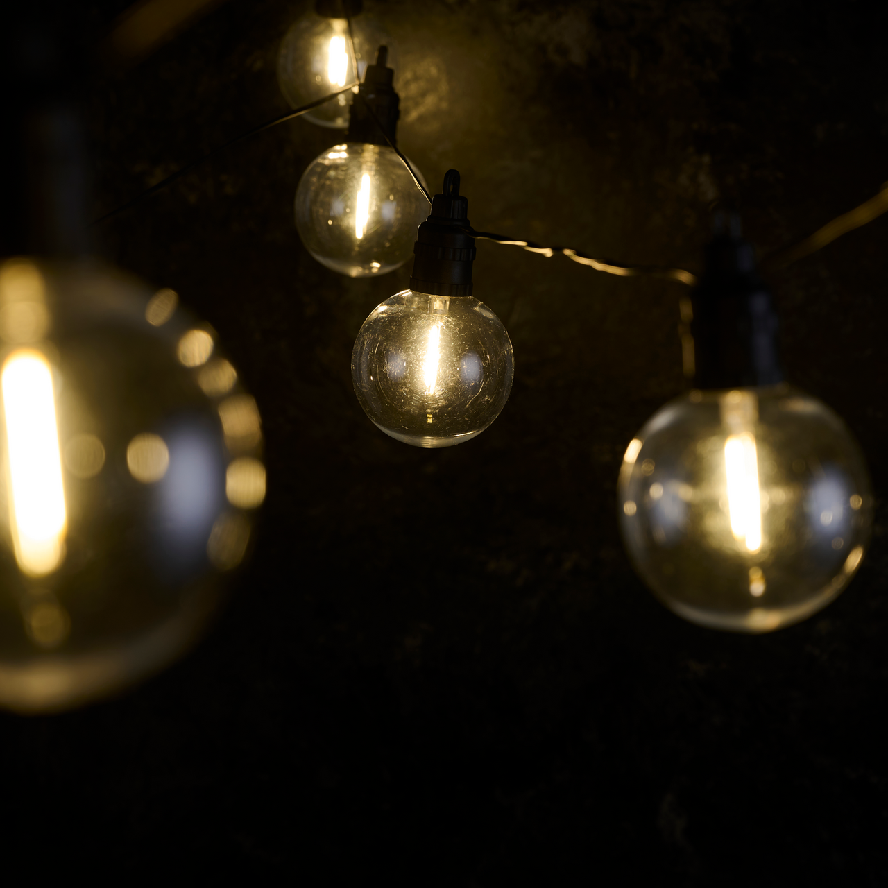 10 LED-pærerLengde: 7,5 meter50 cm mellom hver pæreTimerfunksjon: 6 t på / 18 t av3 x AA batterier(kjøpes separat)IP44Leverandørens varenummer71893