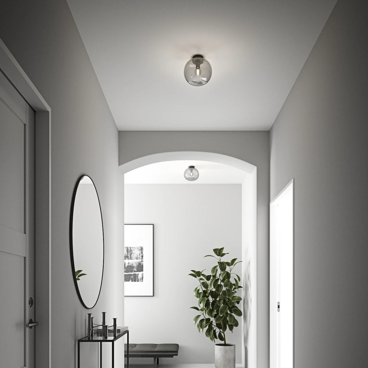 Alton taklampe er en usedvanlig skjønnhet som kombinerer moderne røykfarget glass og matt metall på en ytterst overbevisende måte.