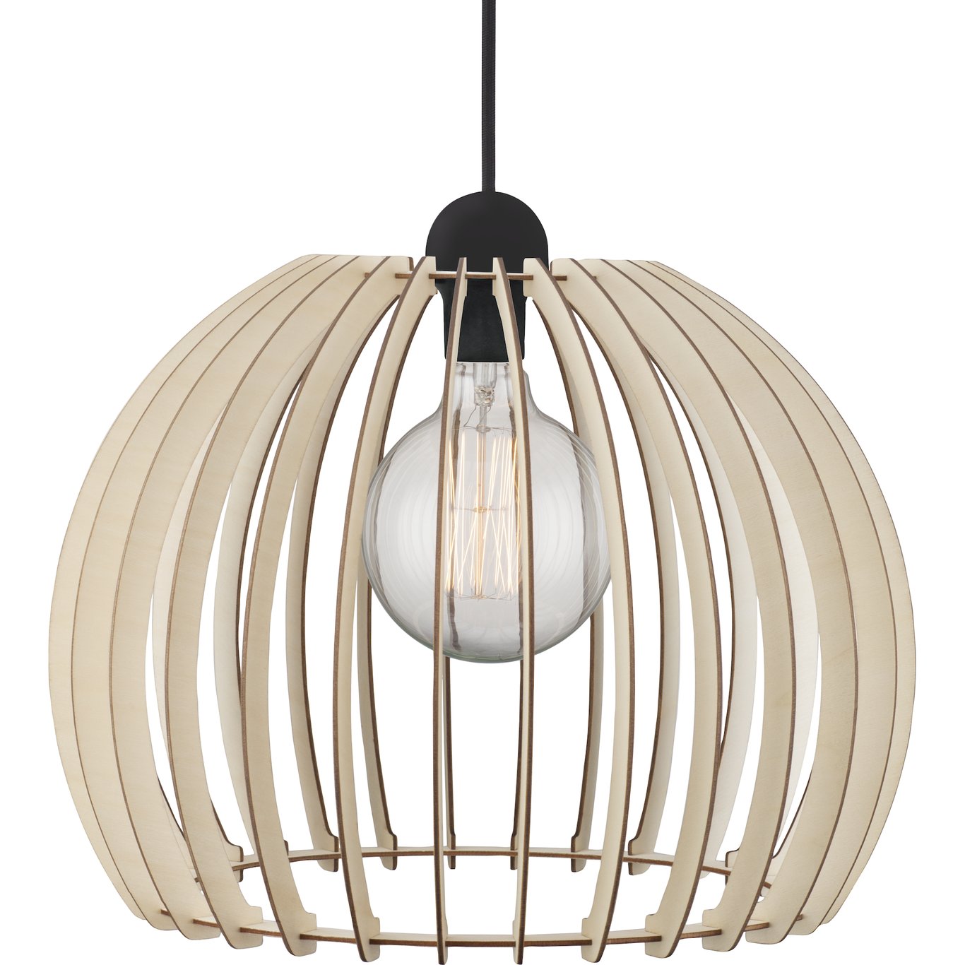 Pendellampe i et grafisk design med en skjerm av trelameller som gir en behagelig lysspredning. Fordi lyskilden er synlig mellom lamellene, anbefales det å supplere lampen med en dekorativ pære. Lampen er blant annet ideell over kjøkken- eller spisebord, og leveres uten lyskilde.