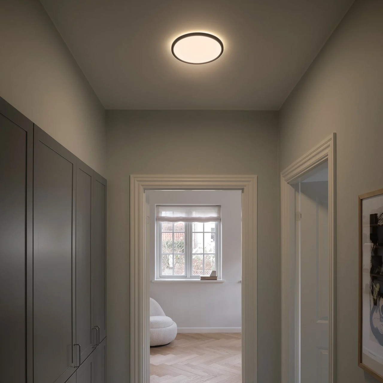 Denne ultratynne plafonden fra Nordlux har et minimalistisk og moderne sort design. Den har integrert LED som gir et behagelig varmhvitt lys.