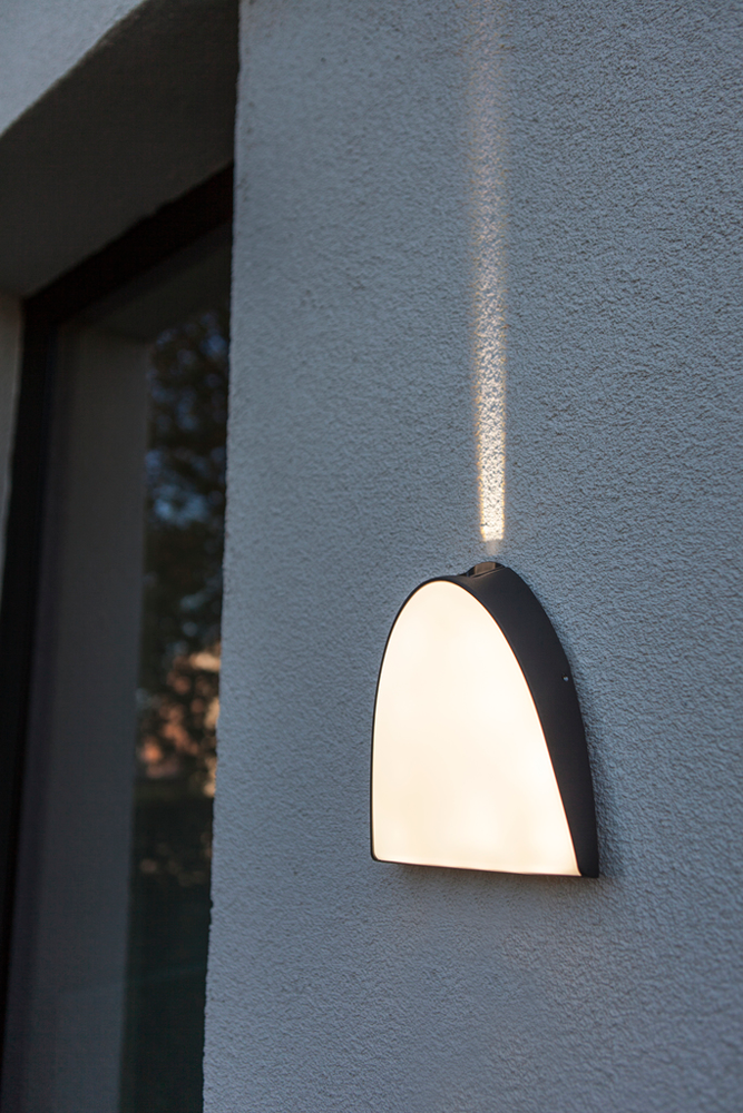 Denne vegglampen fra Lutec vil gi din inngangsdør eller hagevegg et meget unikt uttrykk med sitt behagelige frontlys og sterke lysstripe på toppen.