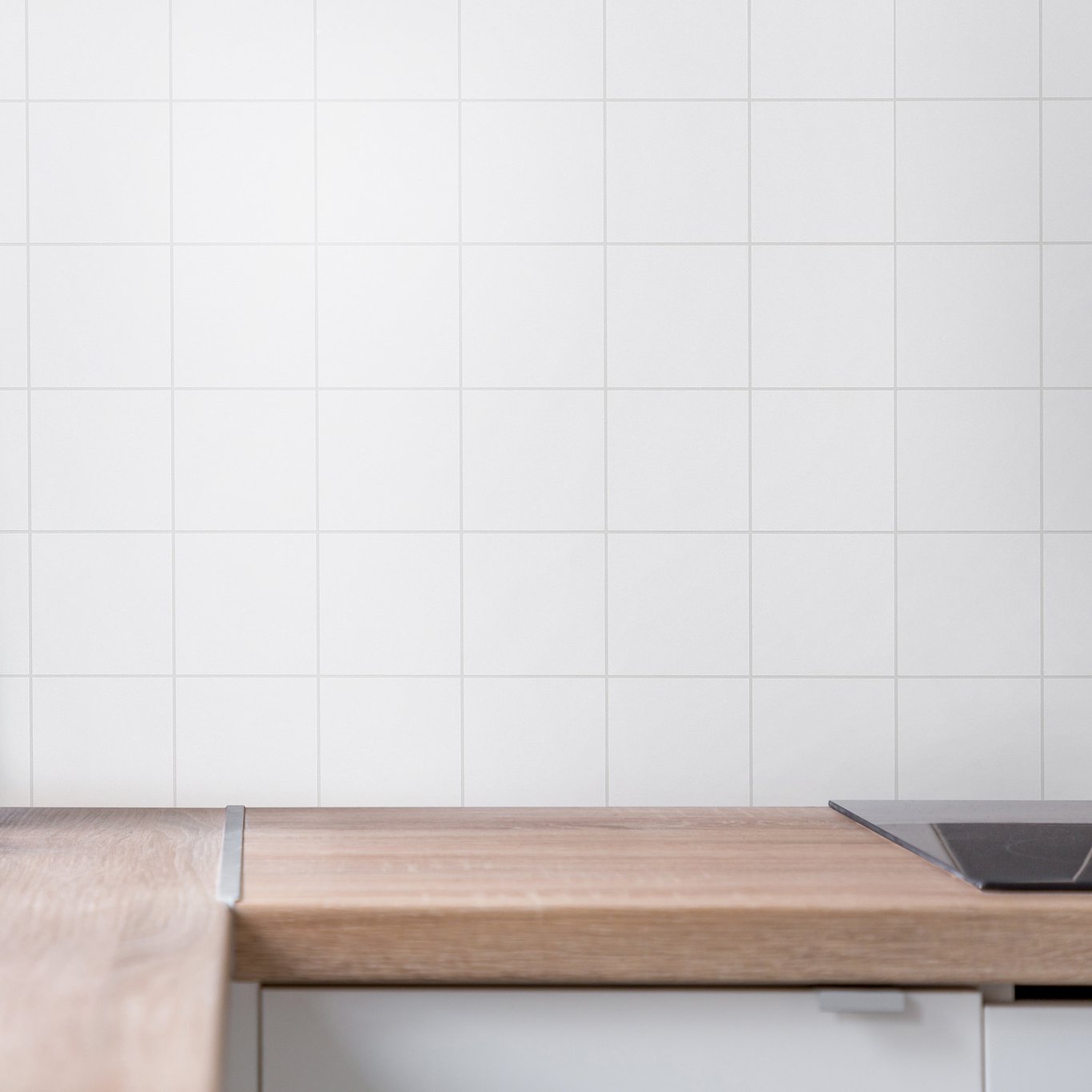Dette kjøkkenpanelet fra BerryAlloc har et tradisjonelt flisemønster i hvit glossy overflate med grå fug. Det er enkelt å montere, og gir en fin og moderne finish.