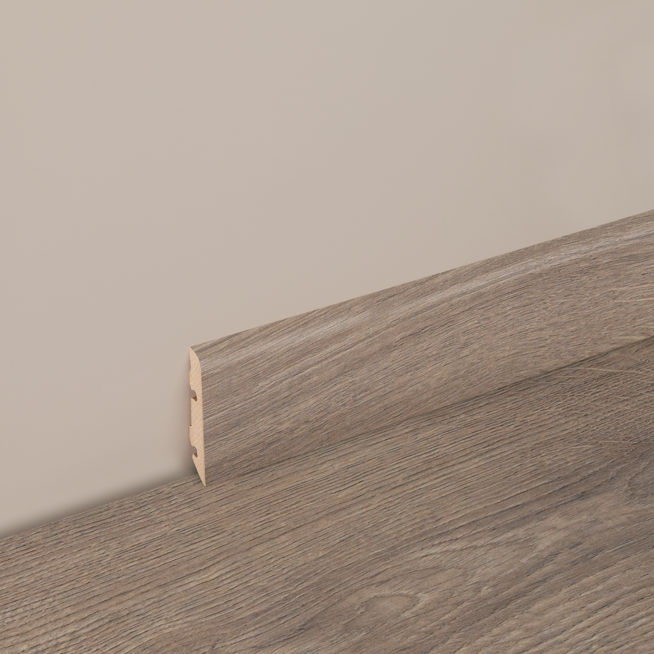 Disse sokkellistene fra BerryAlloc passer til gulv i samme dekor, og gir rommet et helhetlig uttrykk. Listene installeres med lim eller clips.