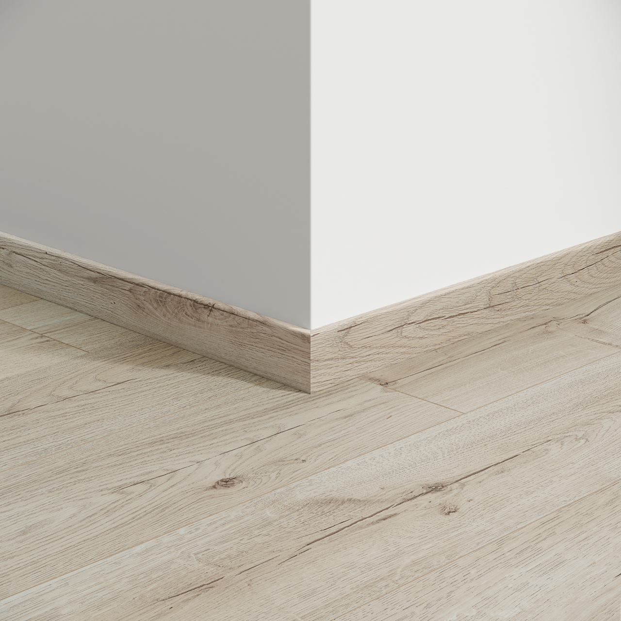 Disse sokkellistene fra BerryAlloc passer til gulv i samme dekor, og gir rommet et helhetlig uttrykk. Listene installeres med lim eller clips.