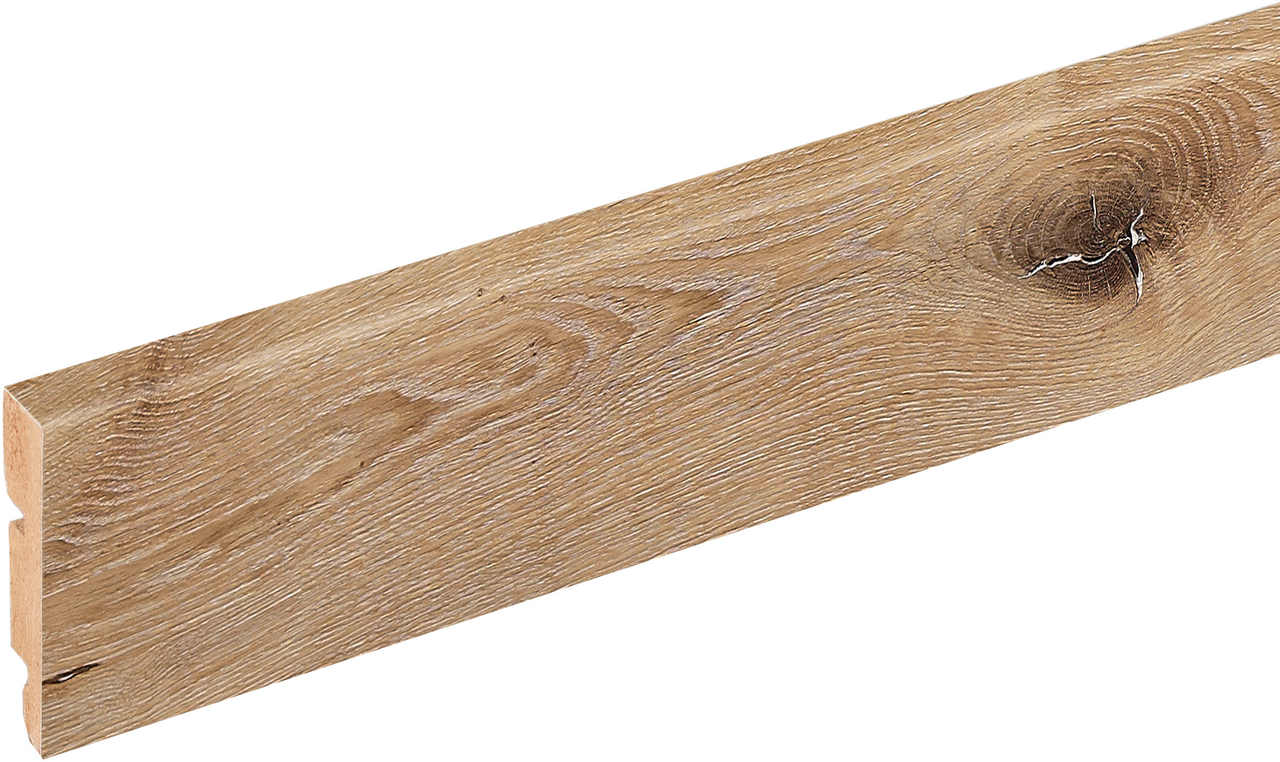 Disse sokkellistene fra BerryAlloc passer til gulv i samme dekor, og gir rommet et helhetlig uttrykk. Listene installeres med lim eller clips.