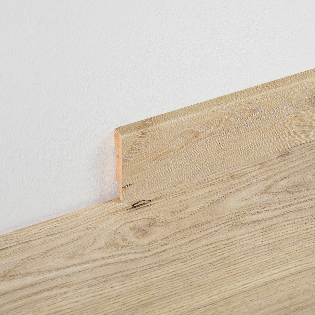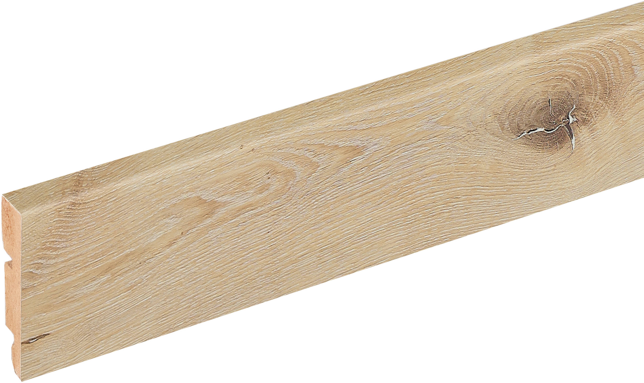 Disse sokkellistene fra BerryAlloc passer til gulv i samme dekor, og gir rommet et helhetlig uttrykk. Listene installeres med lim eller clips.