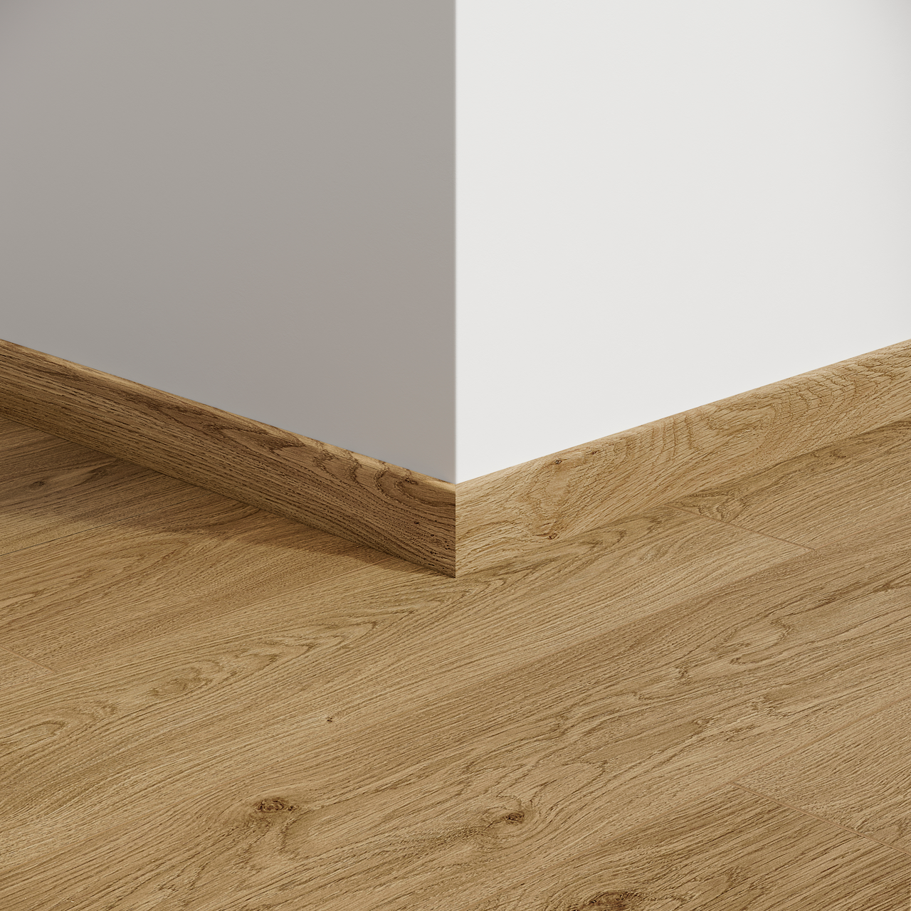 Disse sokkellistene fra BerryAlloc passer til gulv i samme dekor, og gir rommet et helhetlig uttrykk. Listene installeres med lim eller clips.