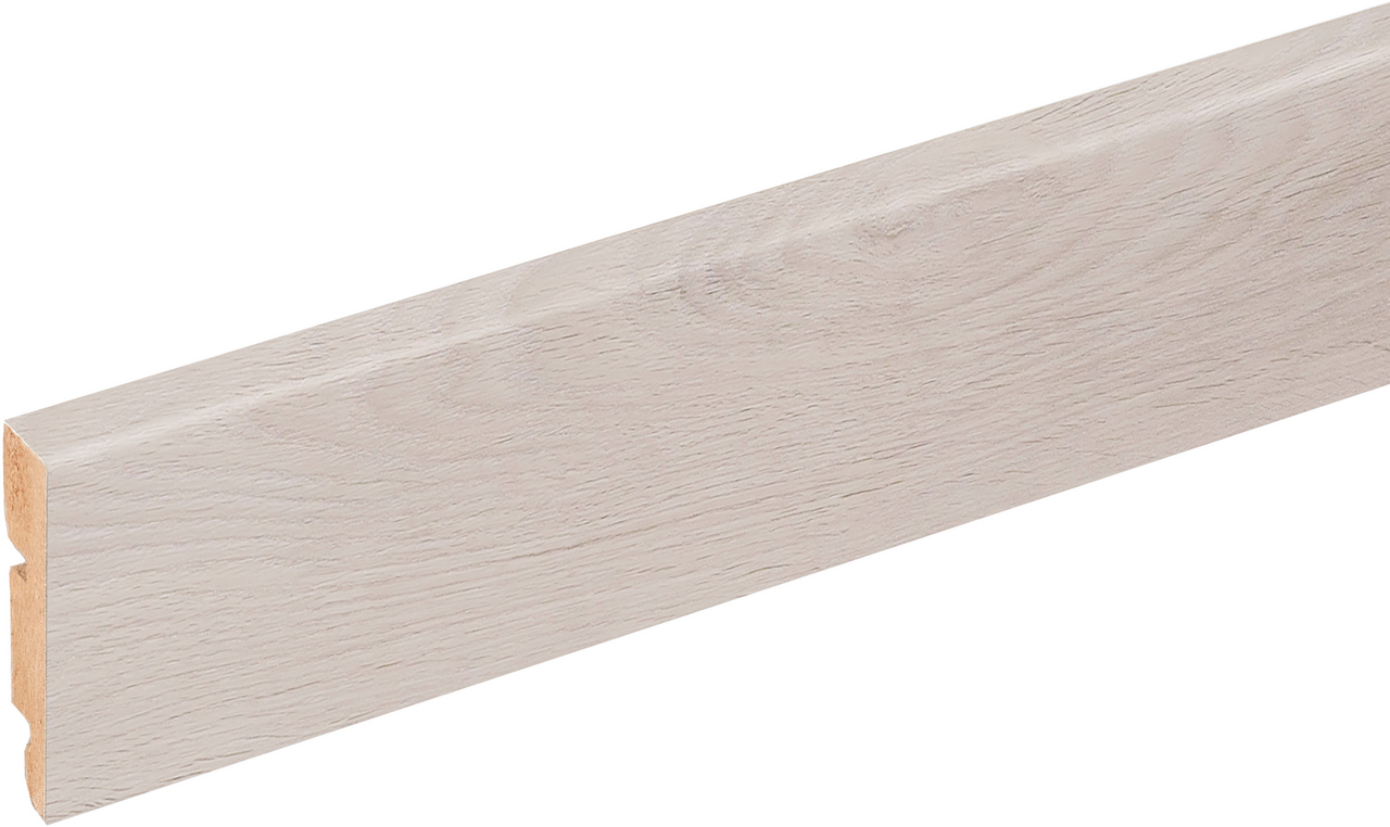 Disse sokkellistene fra BerryAlloc passer til gulv i samme dekor, og gir rommet et helhetlig uttrykk. Listene installeres med lim eller clips.