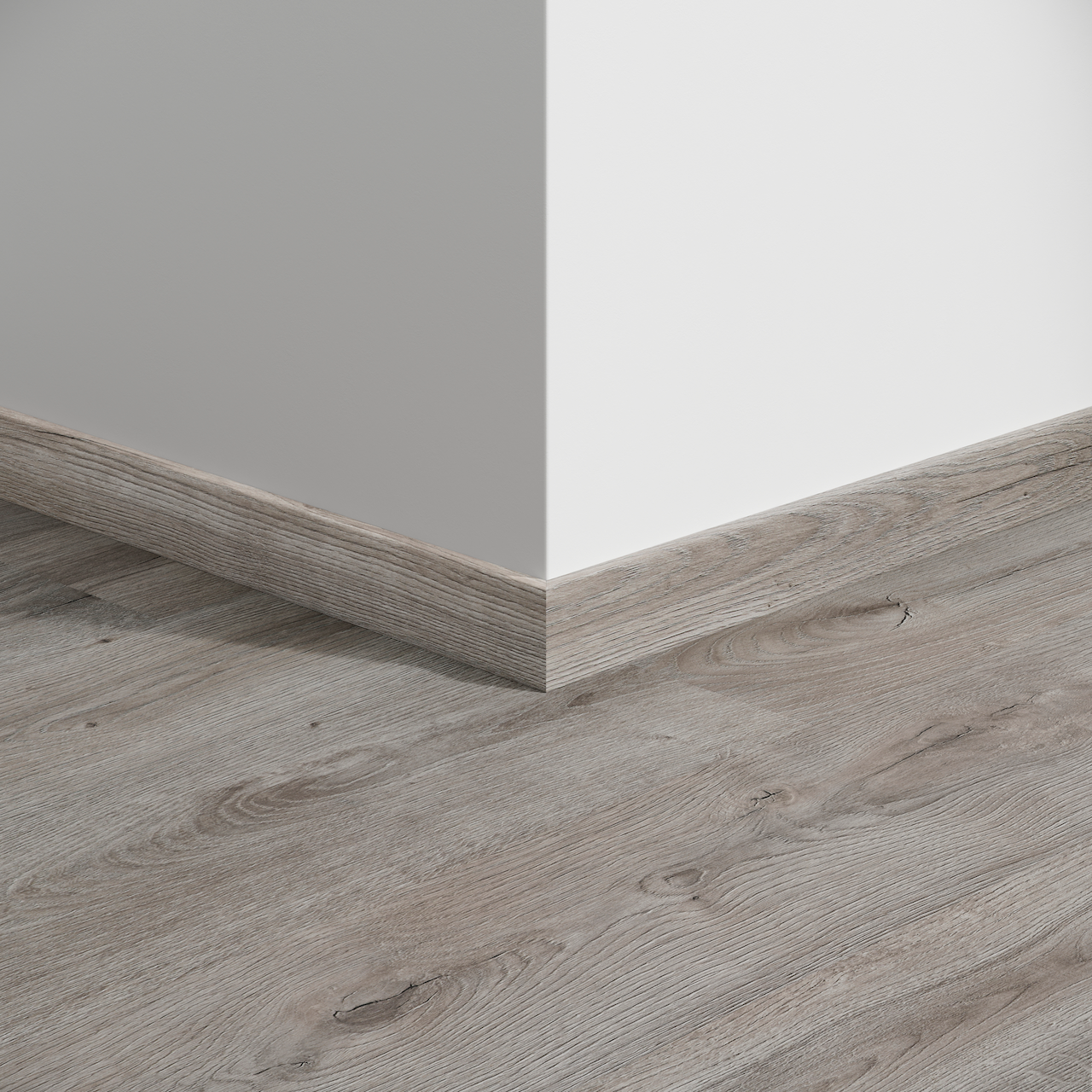 Disse sokkellistene fra BerryAlloc passer til gulv i samme dekor, og gir rommet et helhetlig uttrykk. Listene installeres med lim eller clips.