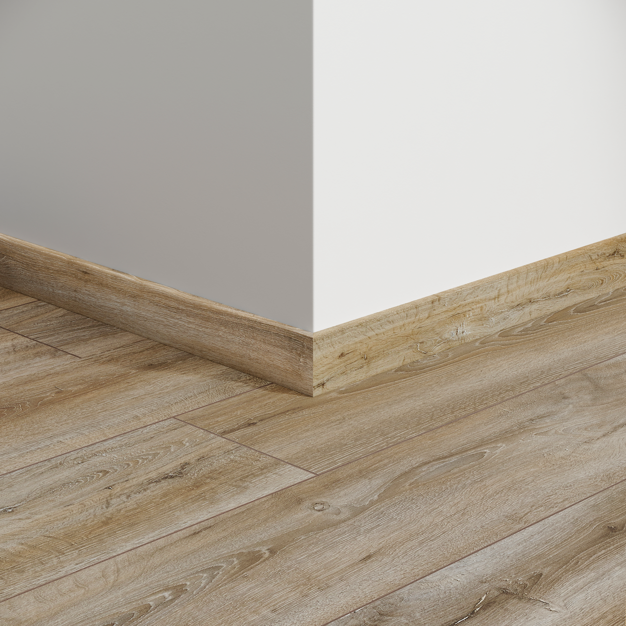 Disse sokkellistene fra BerryAlloc passer til gulv i samme dekor, og gir rommet et helhetlig uttrykk. Listene installeres med lim eller clips.