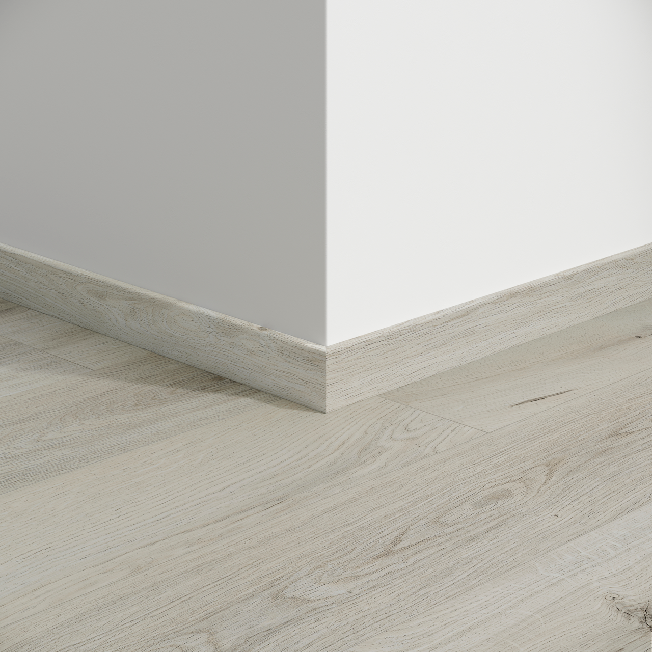 Disse sokkellistene fra BerryAlloc passer til gulv i samme dekor, og gir rommet et helhetlig uttrykk. Listene installeres med lim eller clips.